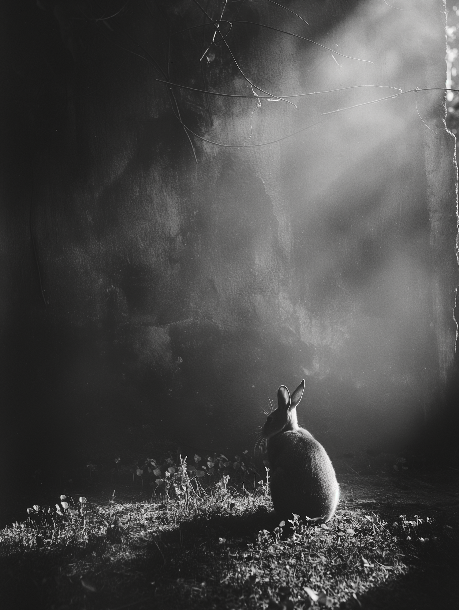 A serene black and white photo of a rabbit in soft light, creating a tranquil and contemplative atmosphere.