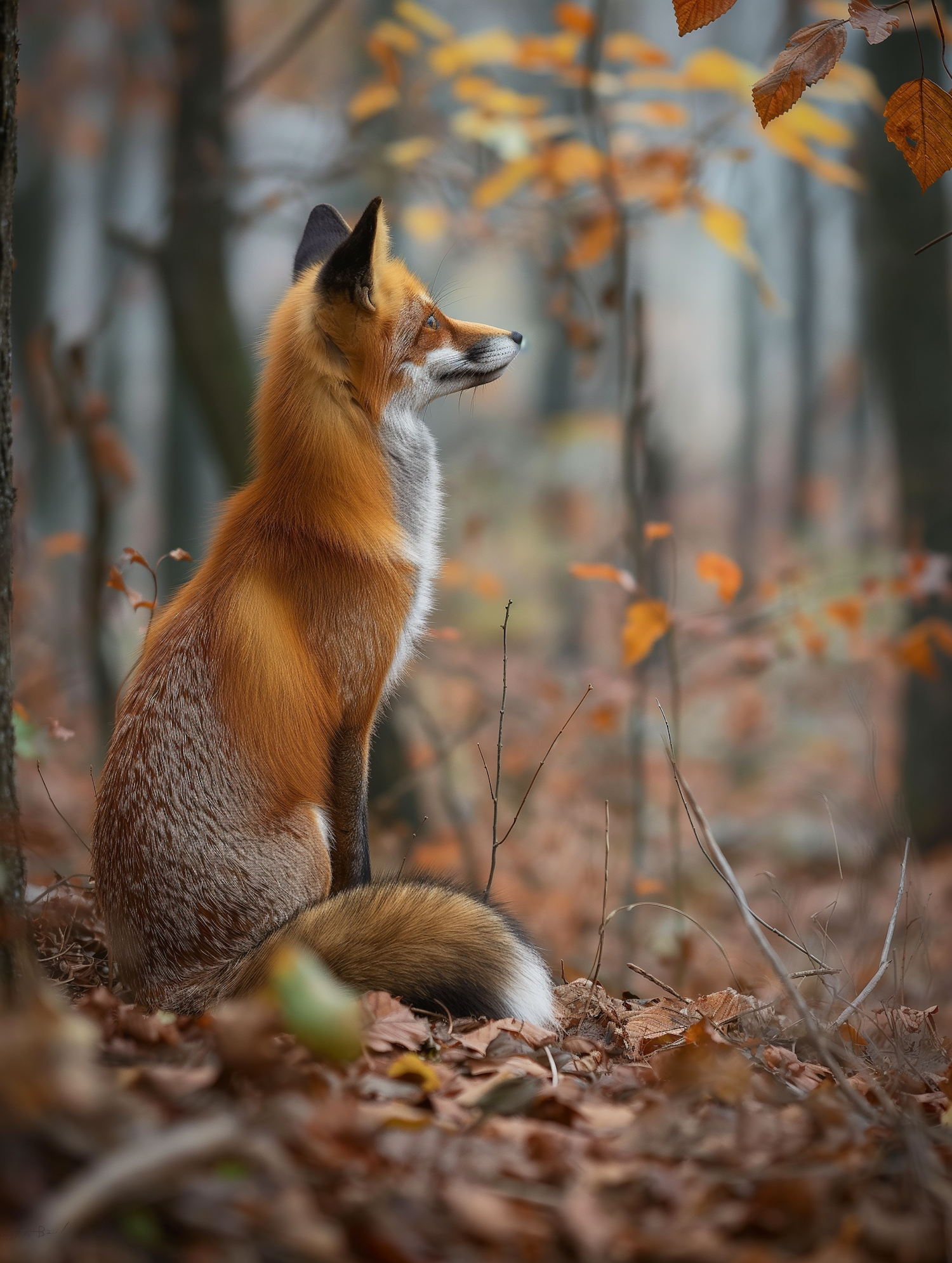 A red fox sits in an autumn forest, surrounded by fallen leaves, gazing upwards. Vibrant fur and a serene setting create a tranquil scene.