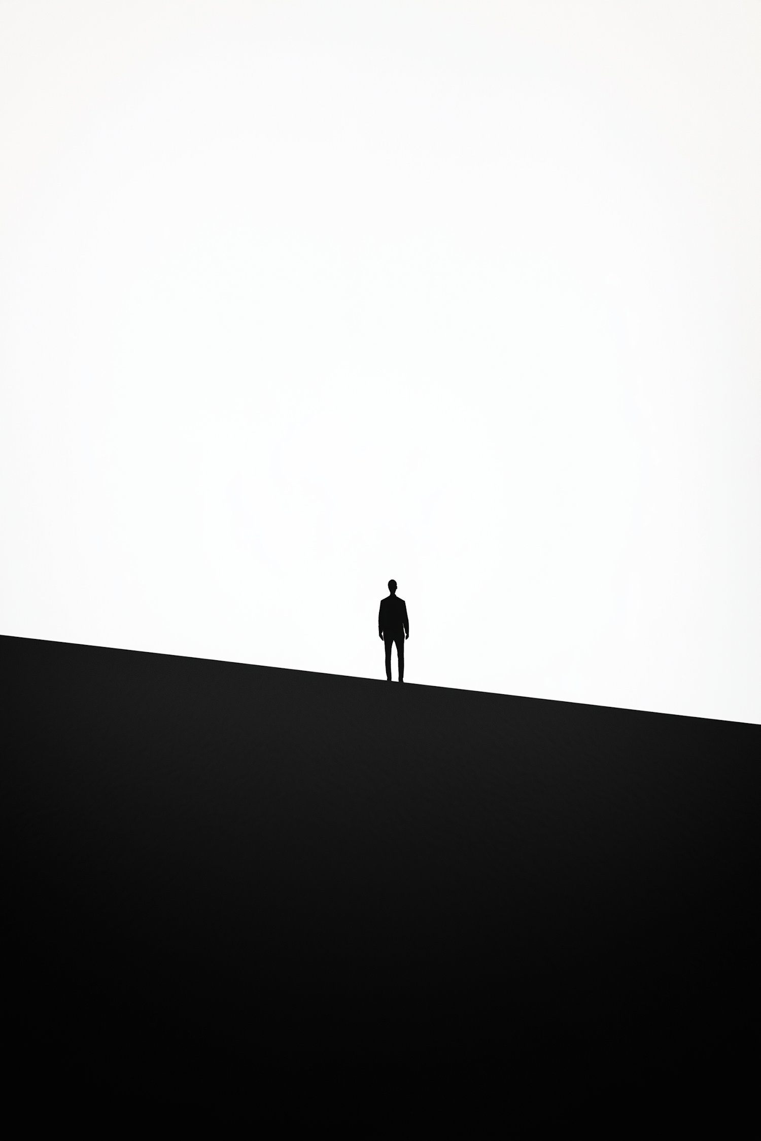 Minimalist silhouette of a lone figure on a sloped surface against a bright white background, evoking solitude and contemplation.