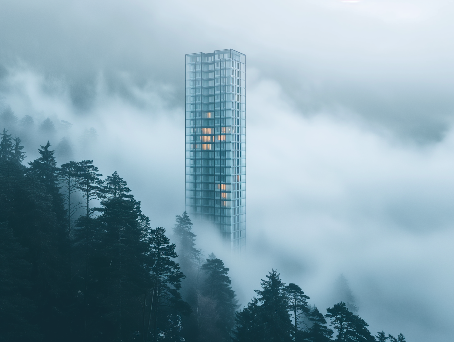 A skyscraper rises through dense fog, surrounded by pine trees, creating a mystical and serene atmosphere.