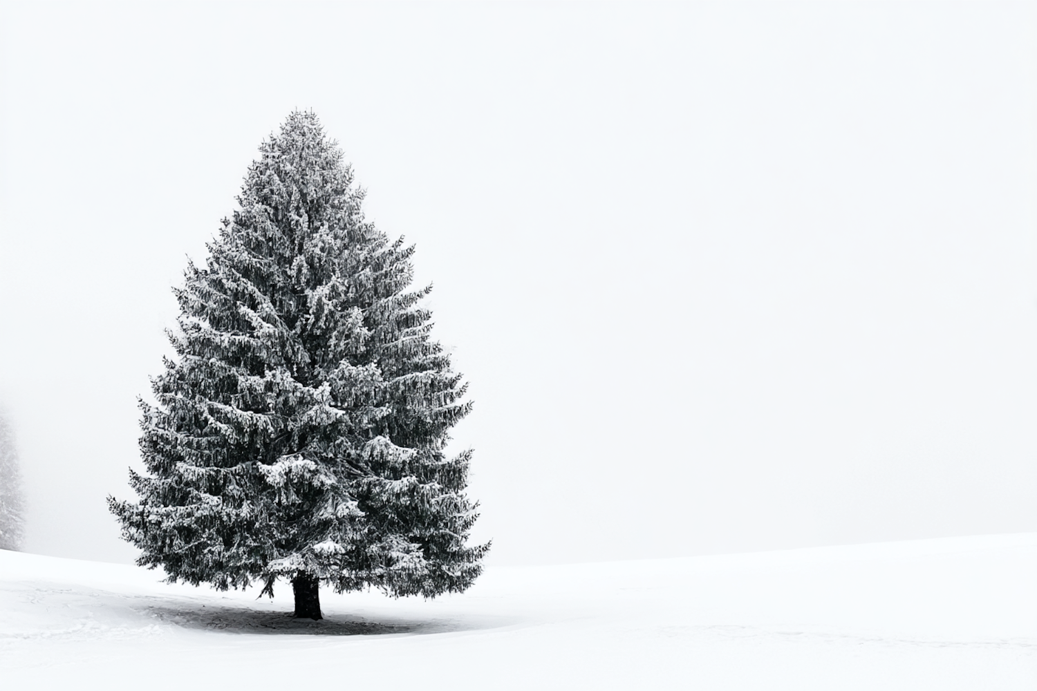 A snow-covered evergreen tree stands alone in a serene, foggy winter landscape, creating a peaceful and minimalistic scene.