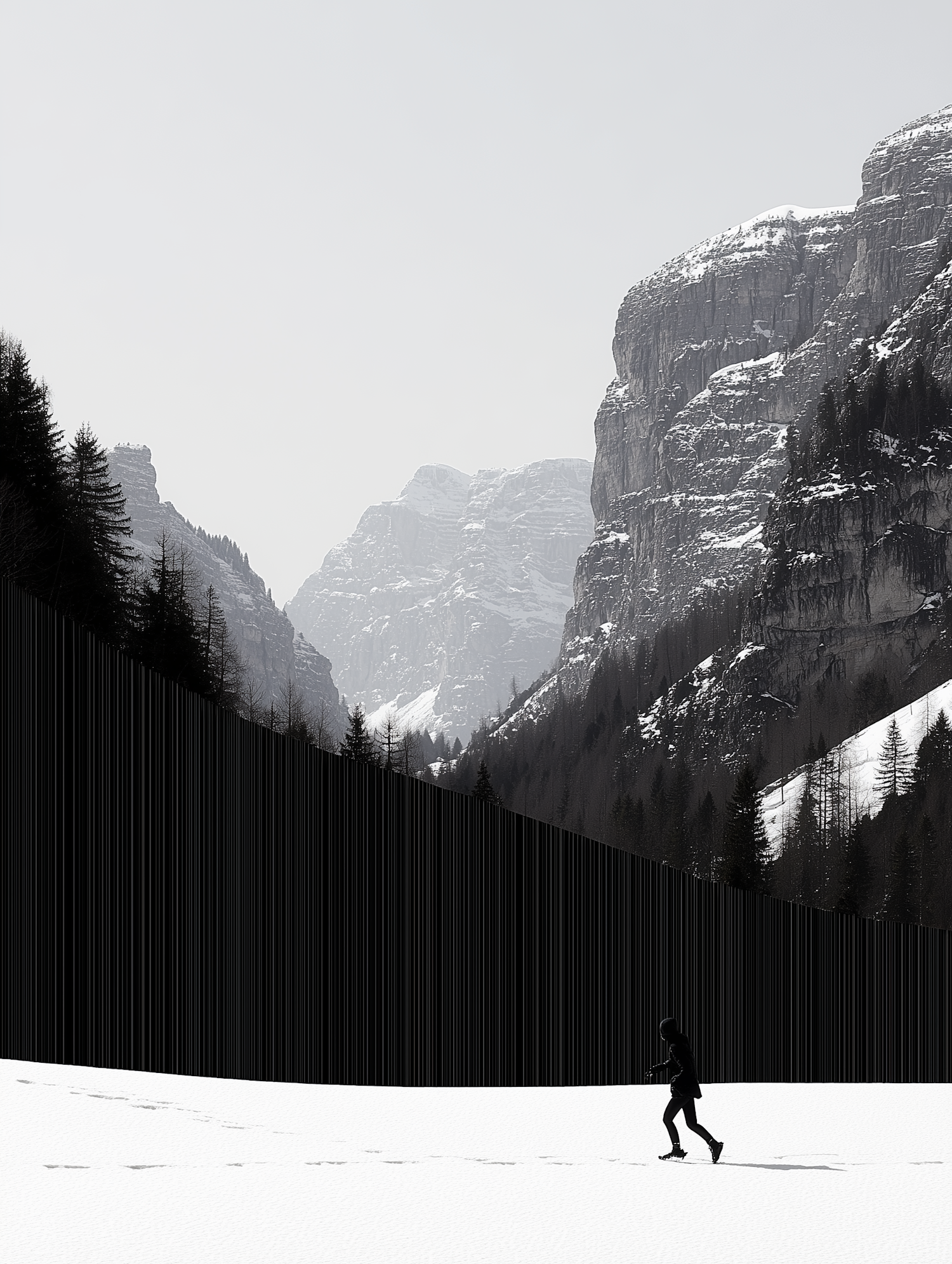 A person walks across a snowy field with towering, snow-covered mountains and dark evergreen trees in the background.