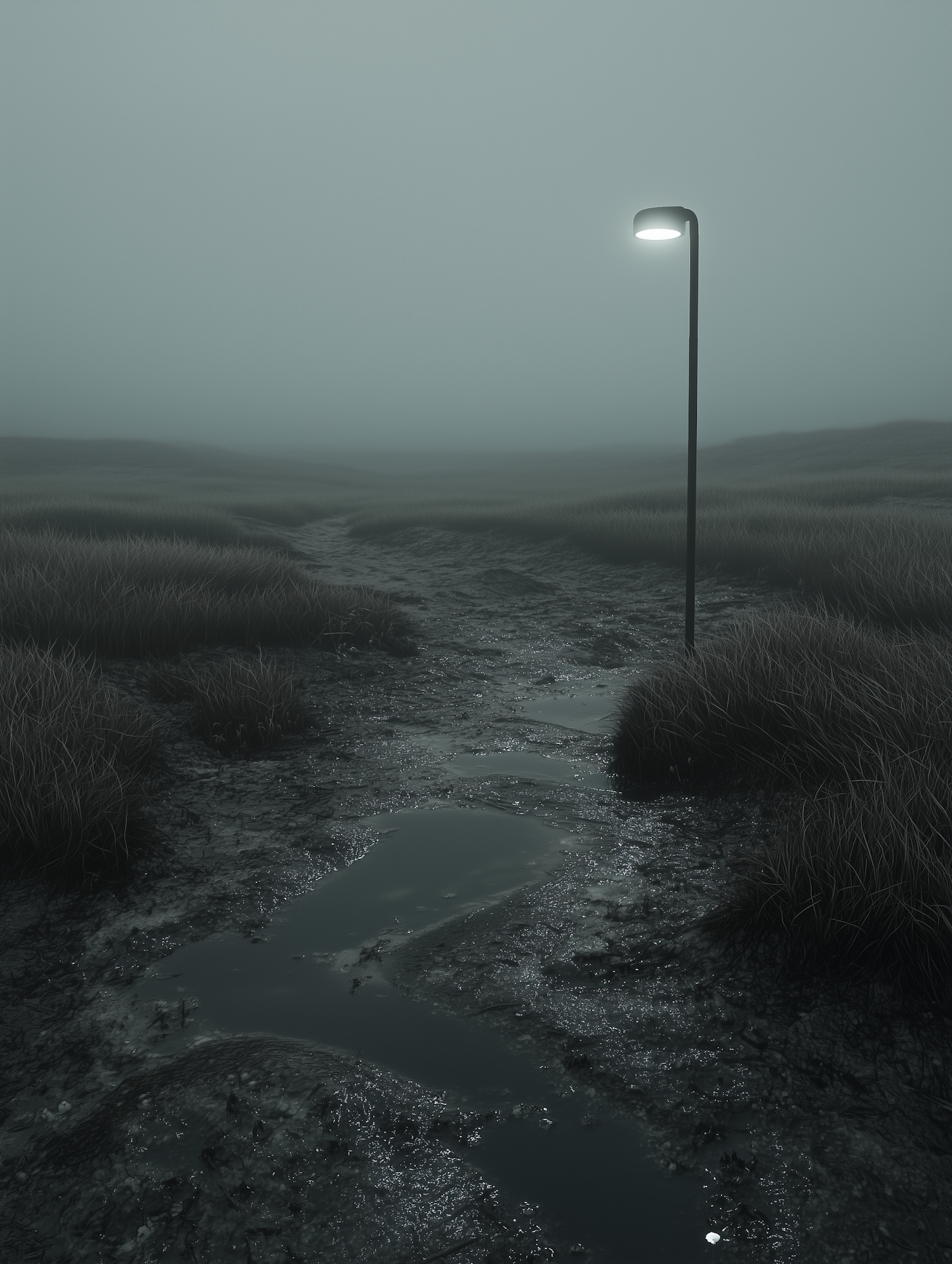 Eerie foggy landscape with a solitary streetlamp illuminating muddy terrain and grass tufts, creating a mysterious atmosphere.