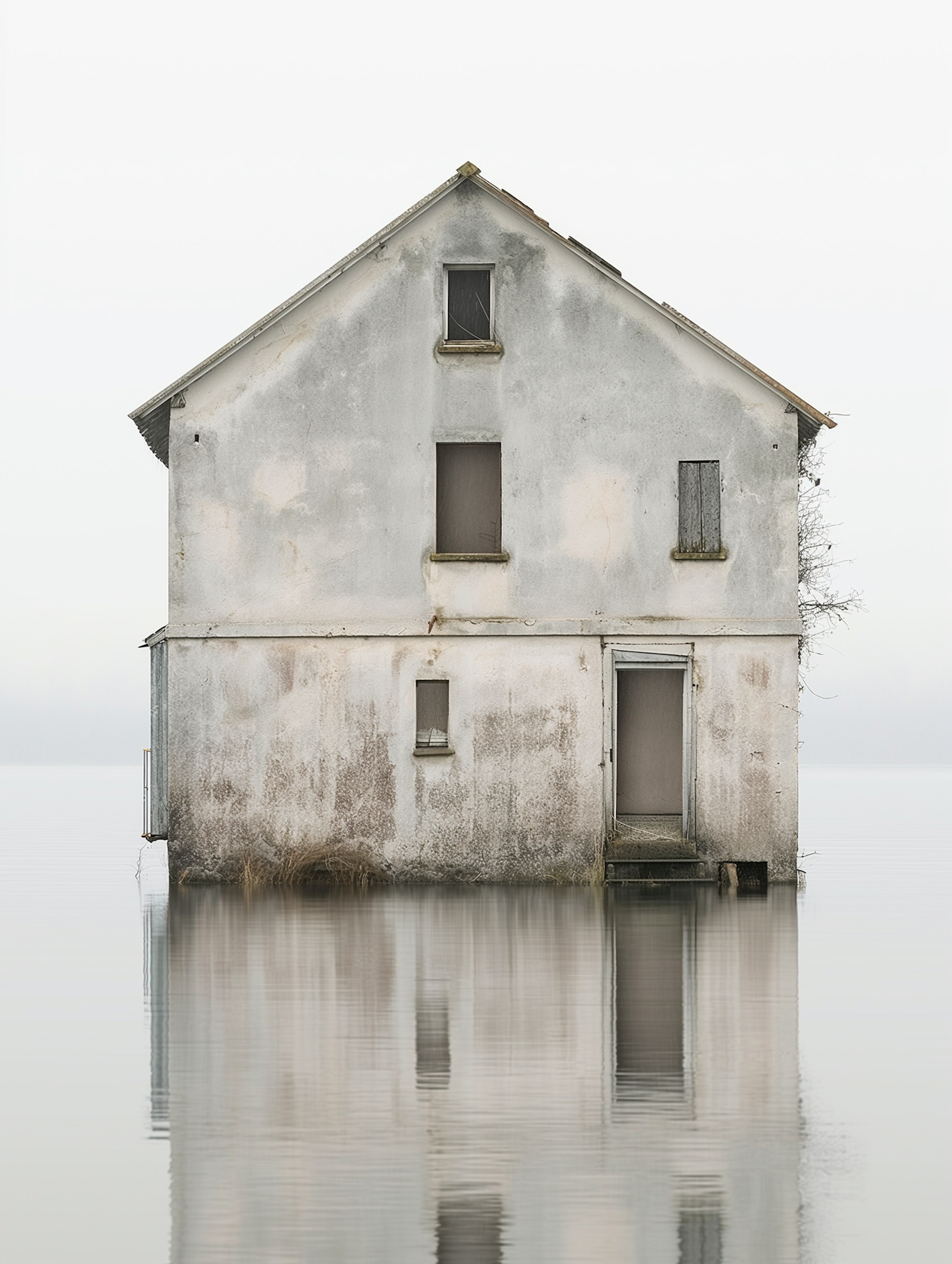 Abandoned house partially submerged in calm water, with boarded windows and a reflective surface creating an eerie, tranquil scene.