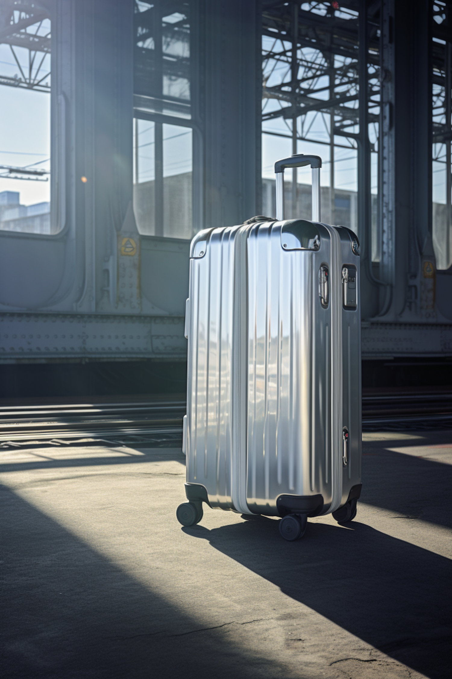 Sleek silver suitcase on a sunlit train platform, reflecting light. Modern design with wheels and handle, set against an industrial backdrop.