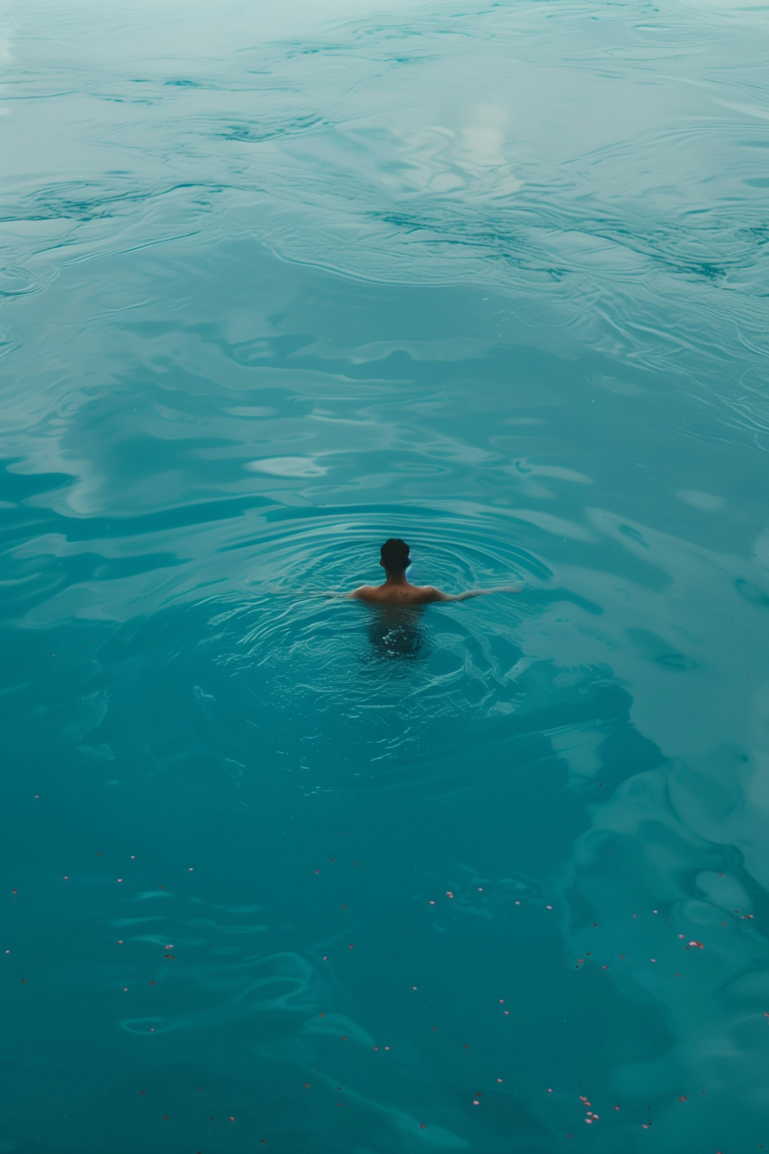 A serene moment of a lone swimmer in calm turquoise water, surrounded by ripples and scattered red specks. Peaceful and tranquil vibes.