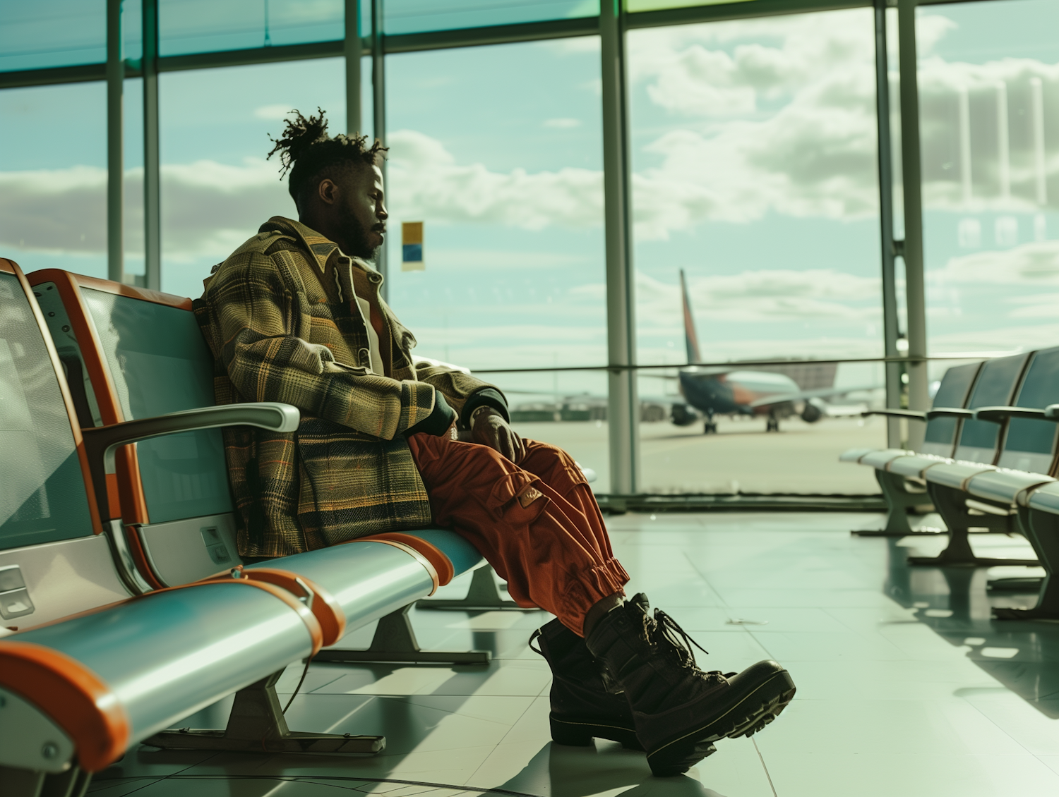 Stylish man in plaid jacket and red pants sits in airport terminal, gazing at airplane outside. Modern seating and soft lighting.
