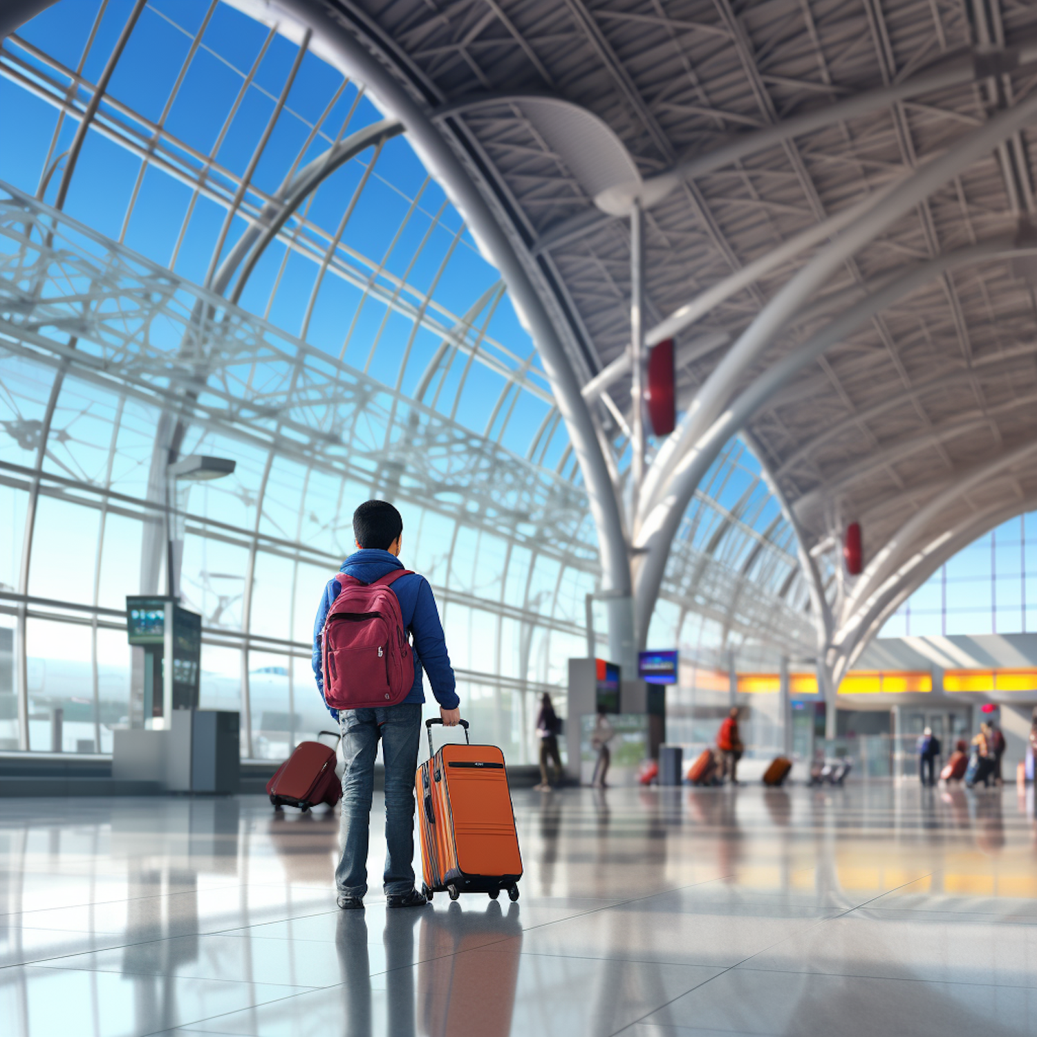 Young boy with red backpack and orange suitcase in a modern airport terminal, surrounded by travelers and bright natural light.