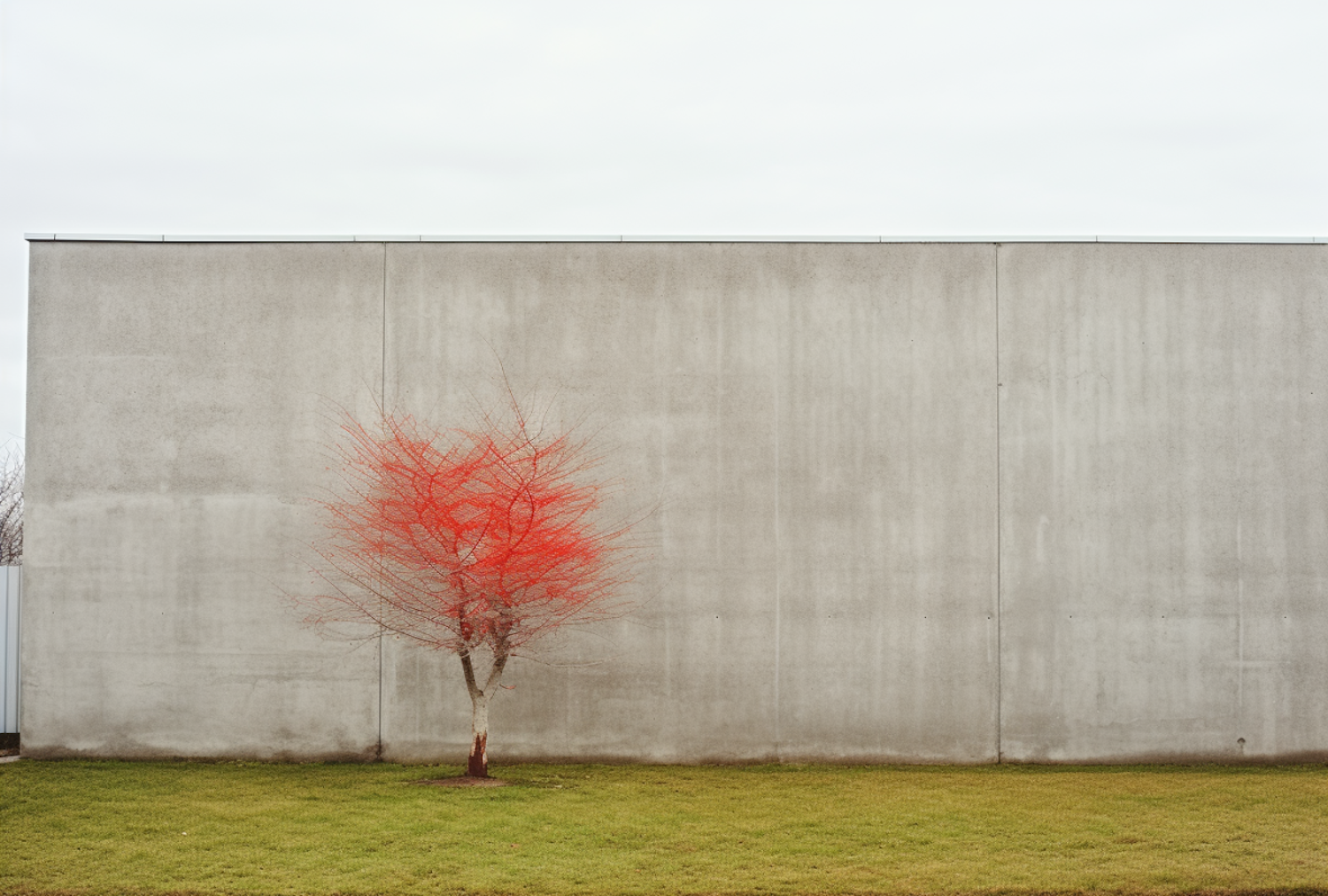 Minimalist scene with a vibrant red tree against a gray concrete wall and green lawn, under an overcast sky.