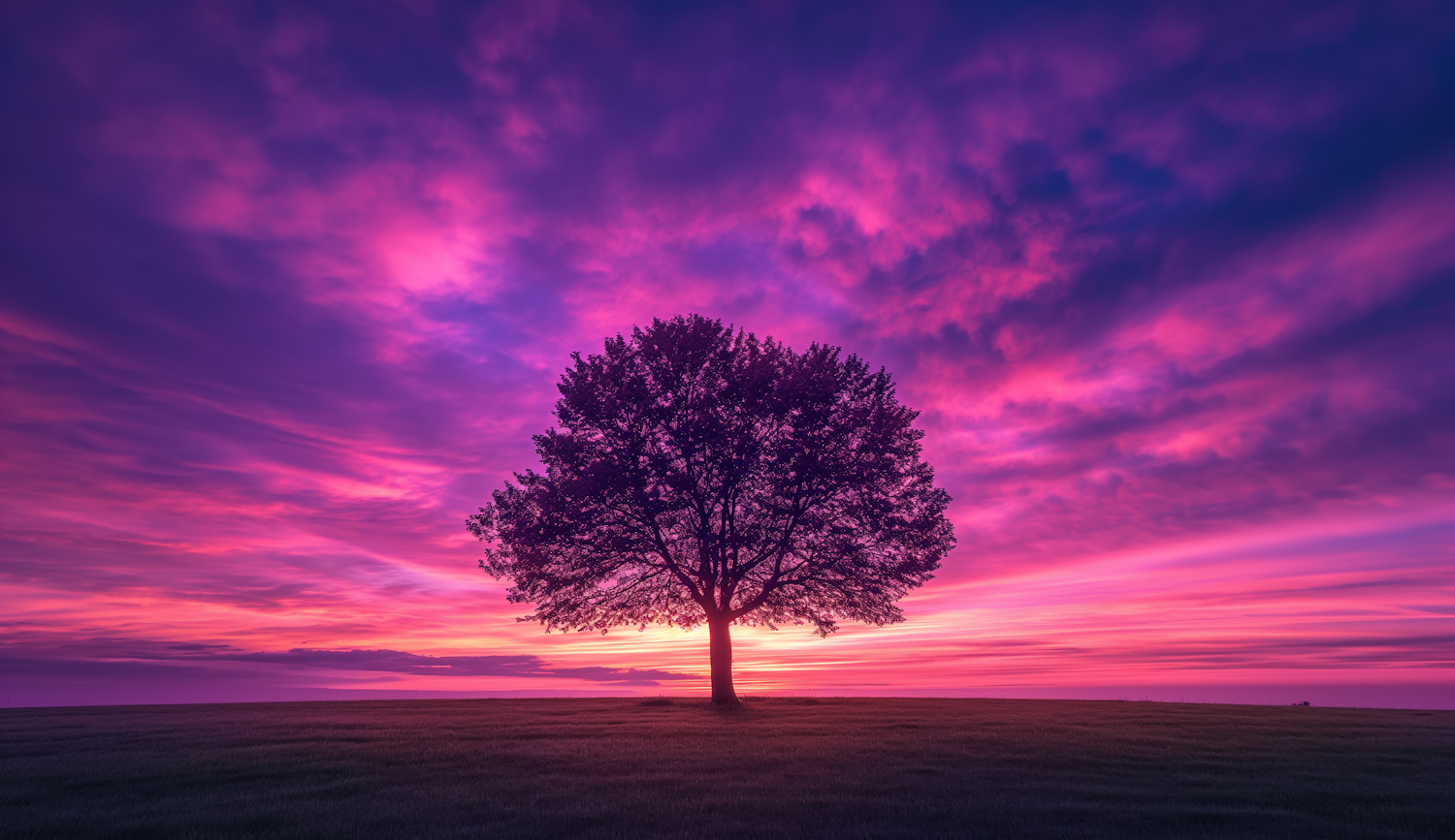 A solitary tree silhouetted against a vibrant purple and pink sunset sky, creating a serene and breathtaking landscape.