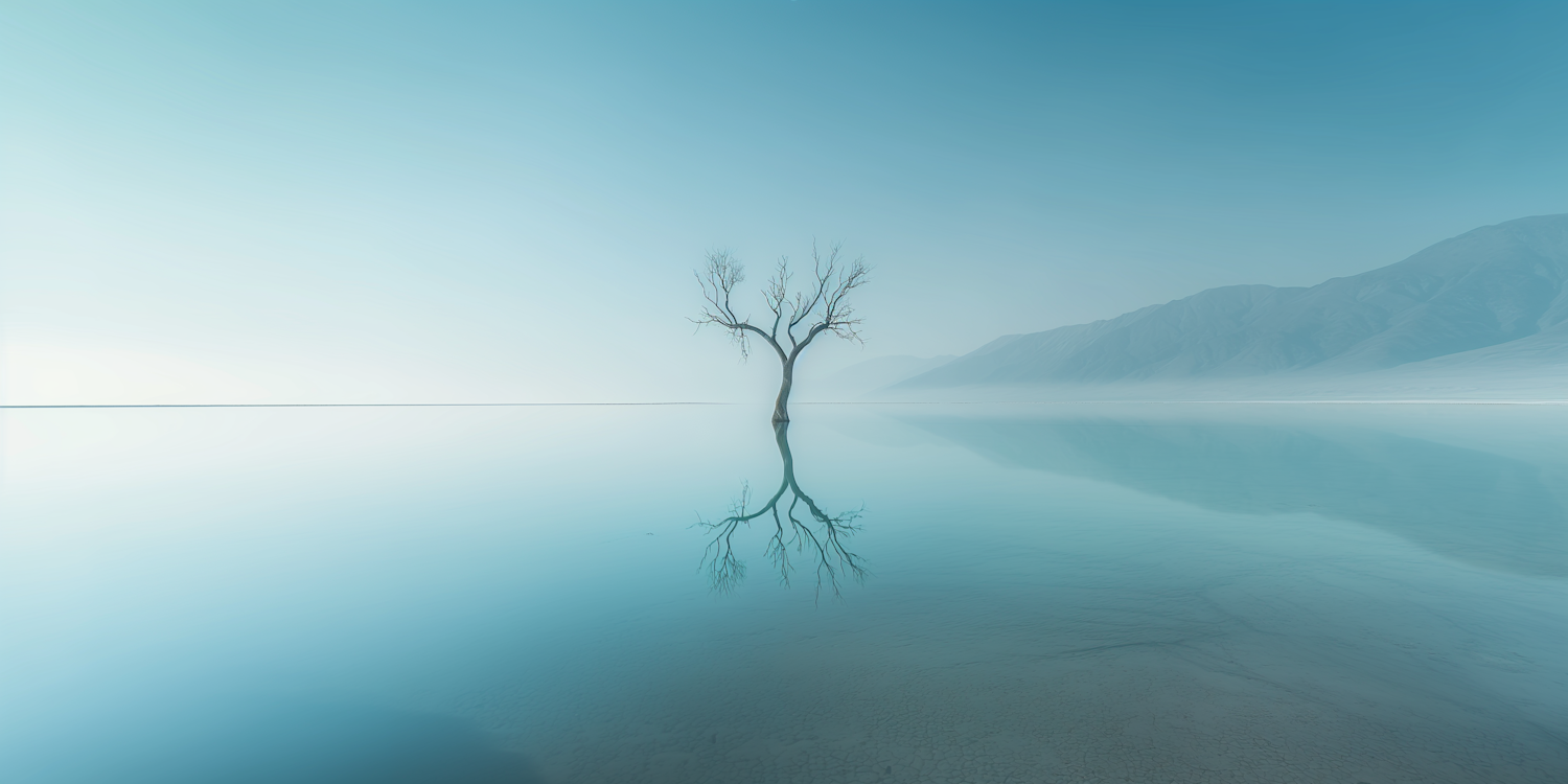 A solitary tree reflected in calm water under a serene blue sky, with distant mountains in the background.