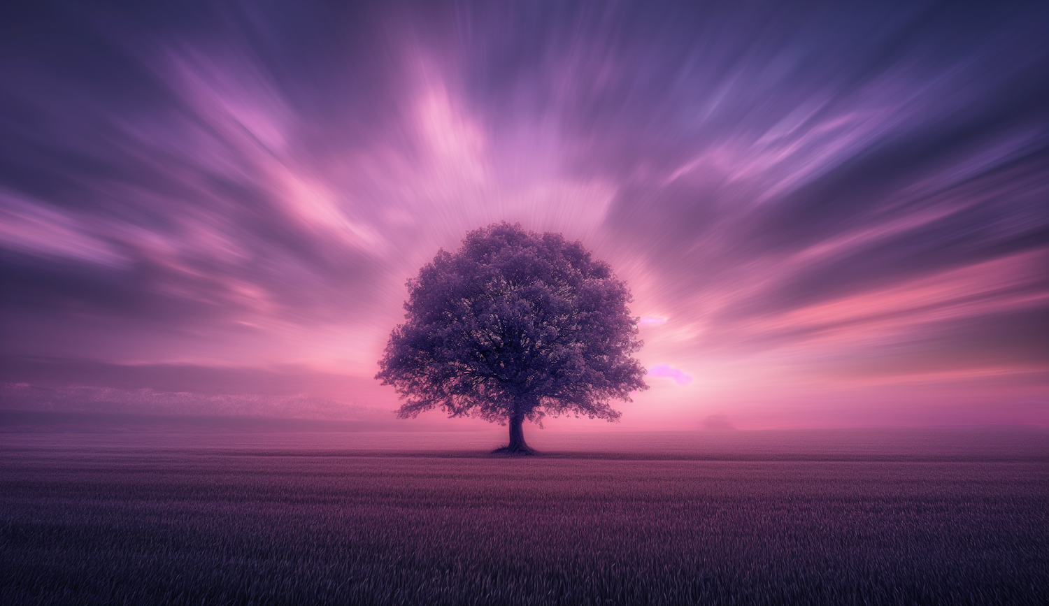 A solitary tree in a field under a surreal pink and purple sky with radiating clouds, creating a dreamlike atmosphere.