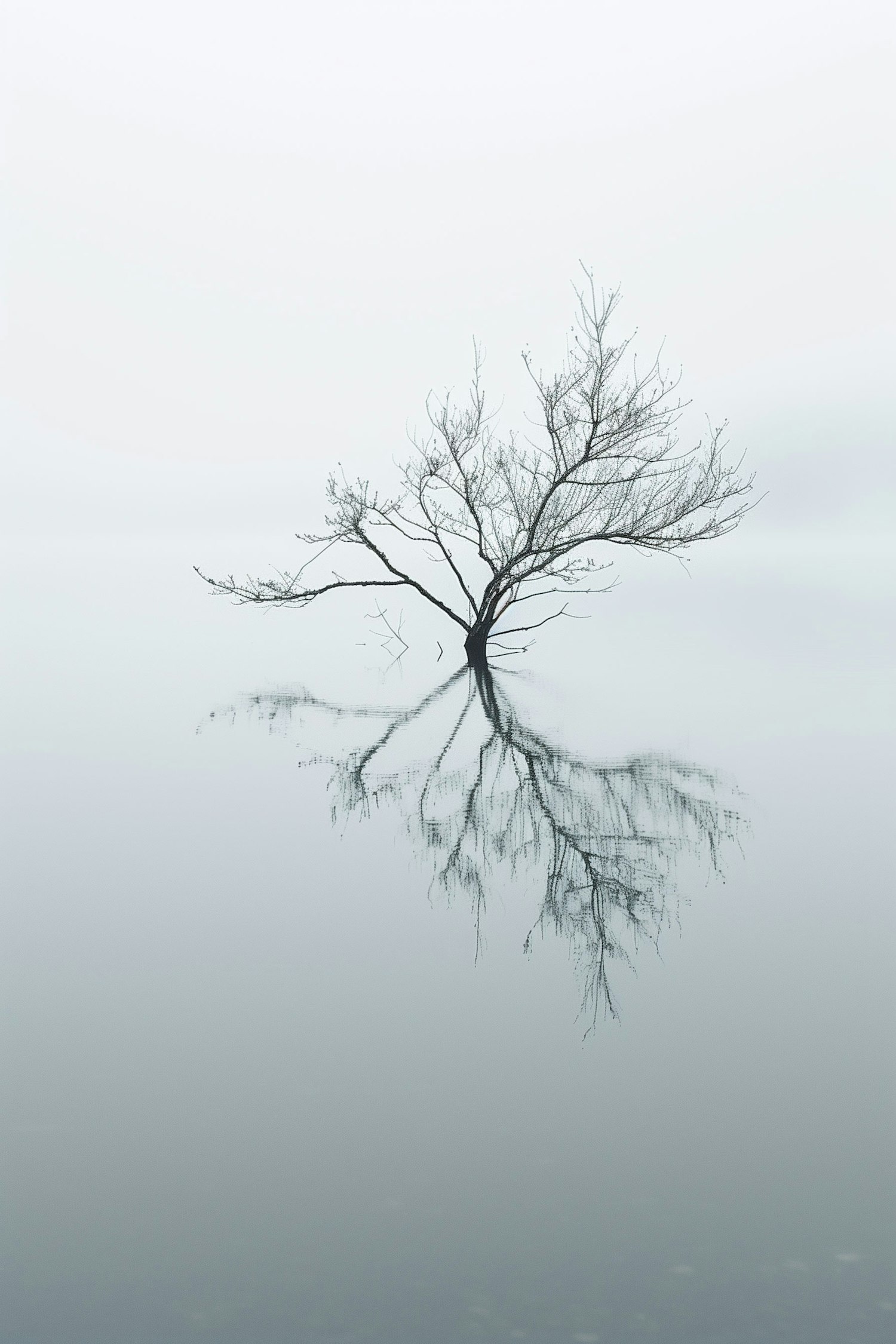 A solitary tree reflected in a misty lake, creating a serene and symmetrical scene with a minimalist, ethereal atmosphere.