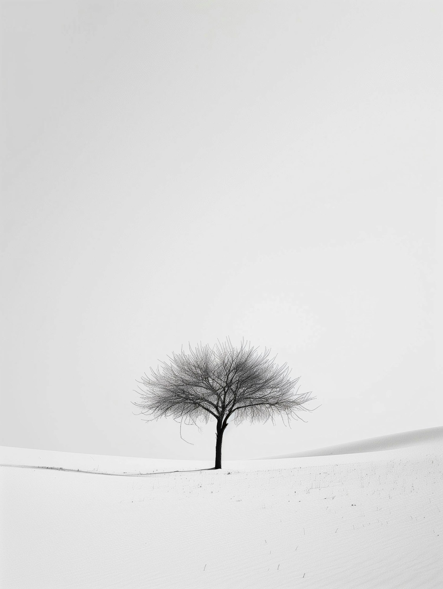 A solitary tree in a vast, snow-covered landscape, creating a serene and minimalist scene with a stark contrast against the white snow.