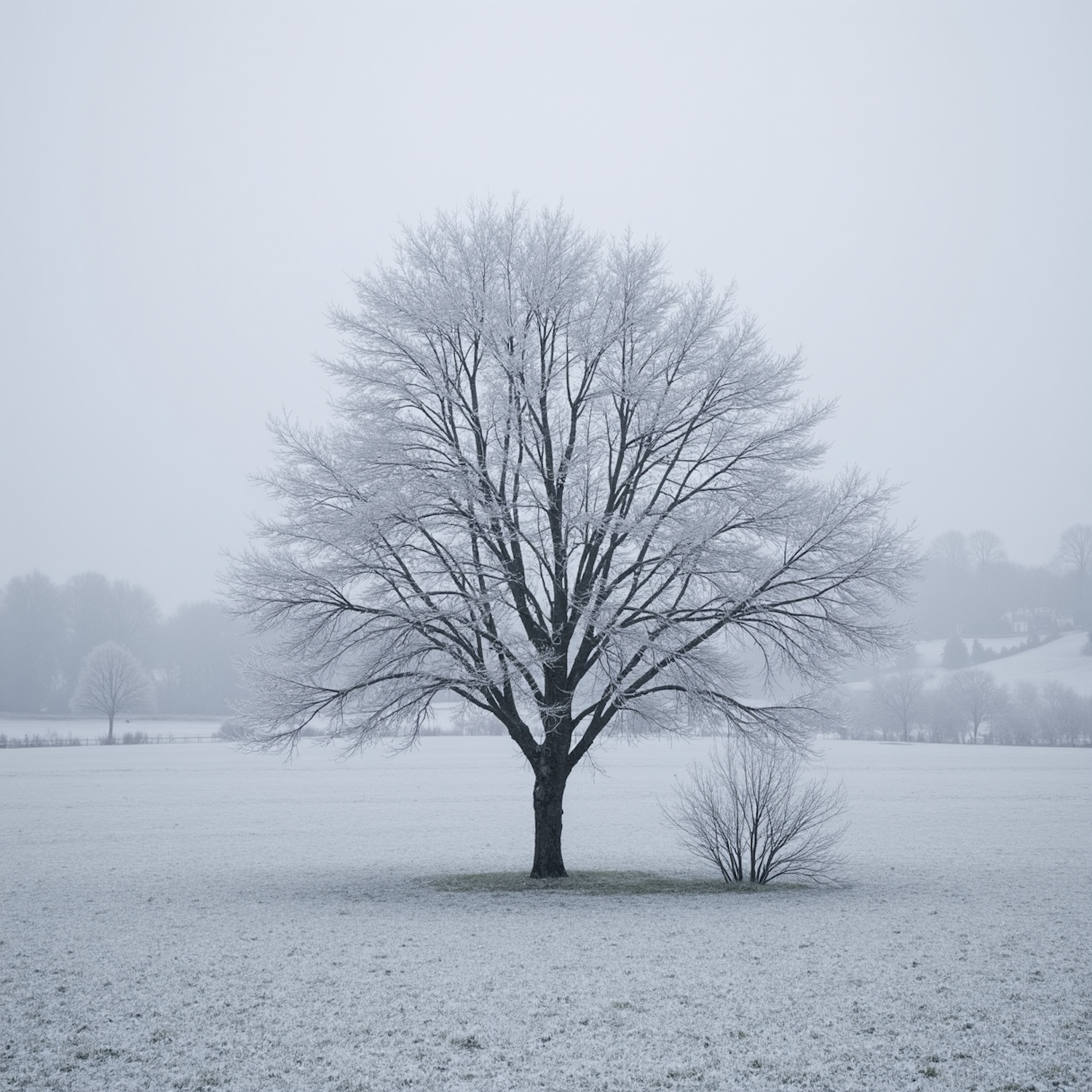 Frost-covered tree in a snowy field with a misty background, creating a serene and tranquil winter landscape.