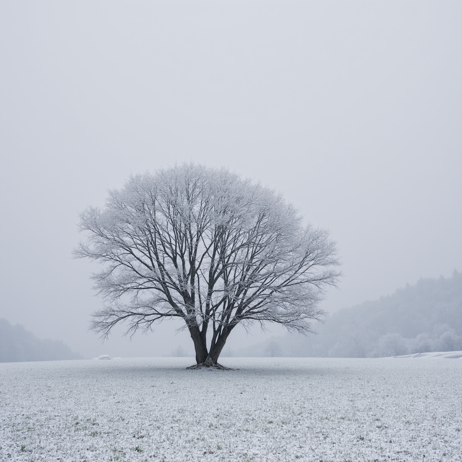 A lone tree in a snowy field under an overcast sky, creating a serene winter landscape with soft whites and grays.