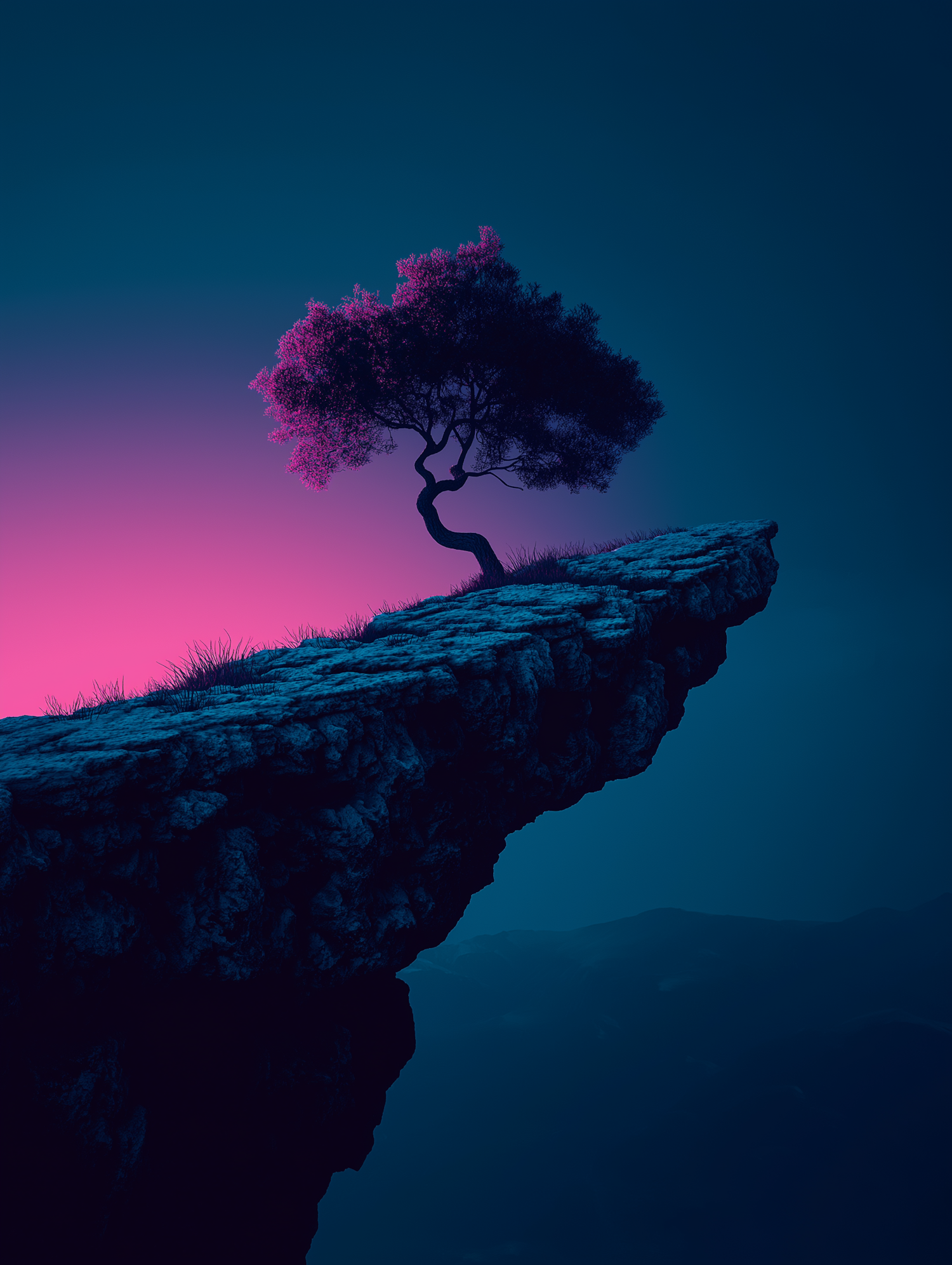 A solitary tree with pink leaves stands on a cliff edge against a vibrant pink and blue sky, creating a surreal and dramatic scene.