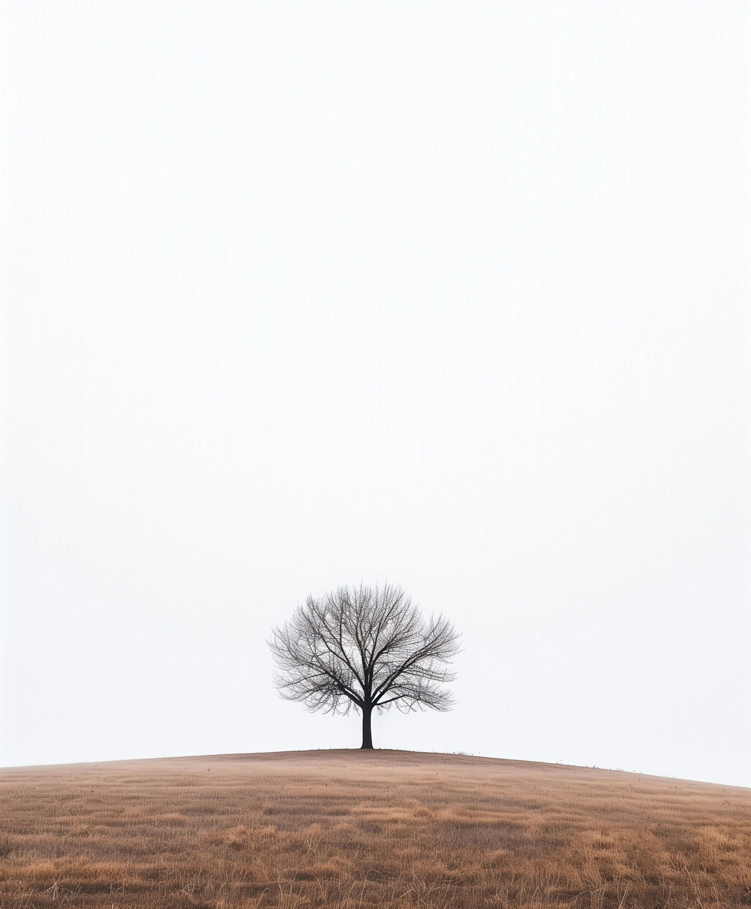 Minimalist landscape with a solitary tree on a hill against a pale sky, evoking serenity and isolation.