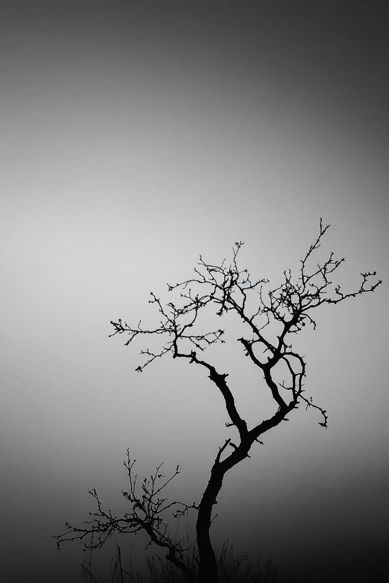 Silhouette of a leafless tree against a gradient gray sky, creating a serene and contemplative scene.