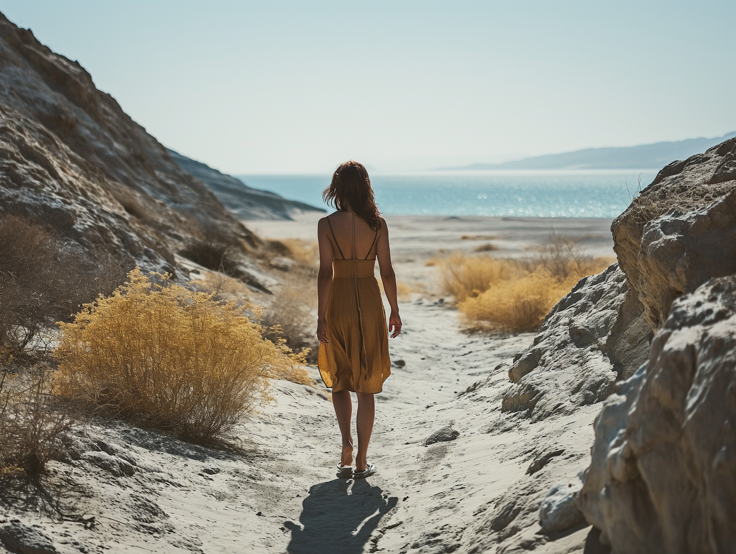 Woman in a mustard dress walking barefoot on a sandy path between cliffs, with a distant view of a shimmering body of water.