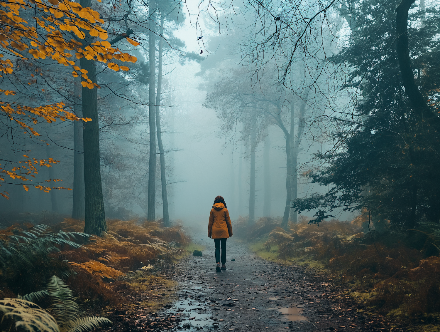 A person in an orange jacket walks through a misty forest, surrounded by tall trees and autumn leaves, creating a serene atmosphere.
