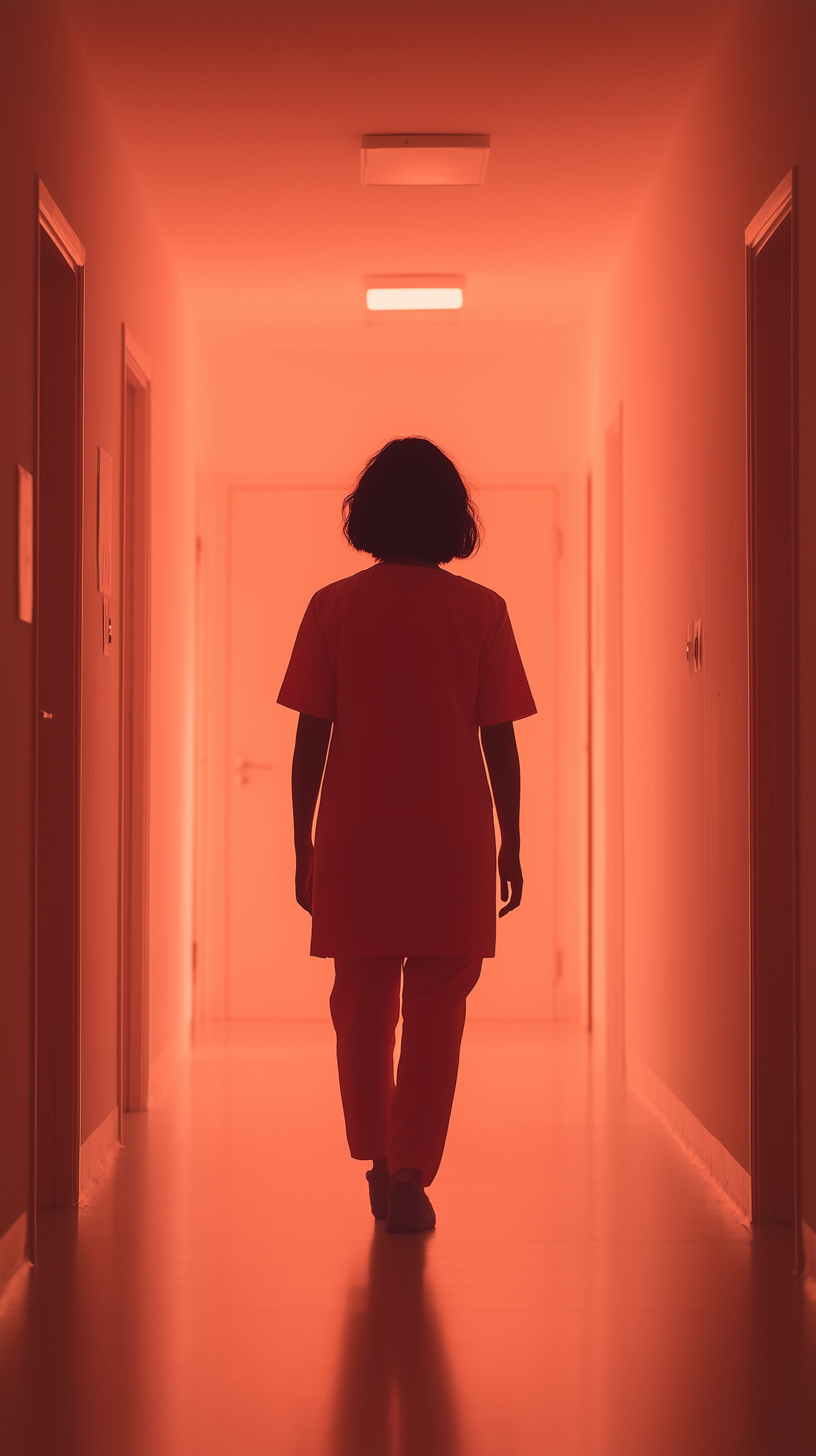 Person in red-lit hallway, wearing uniform, walking away. Dramatic and mysterious atmosphere with intense red lighting.