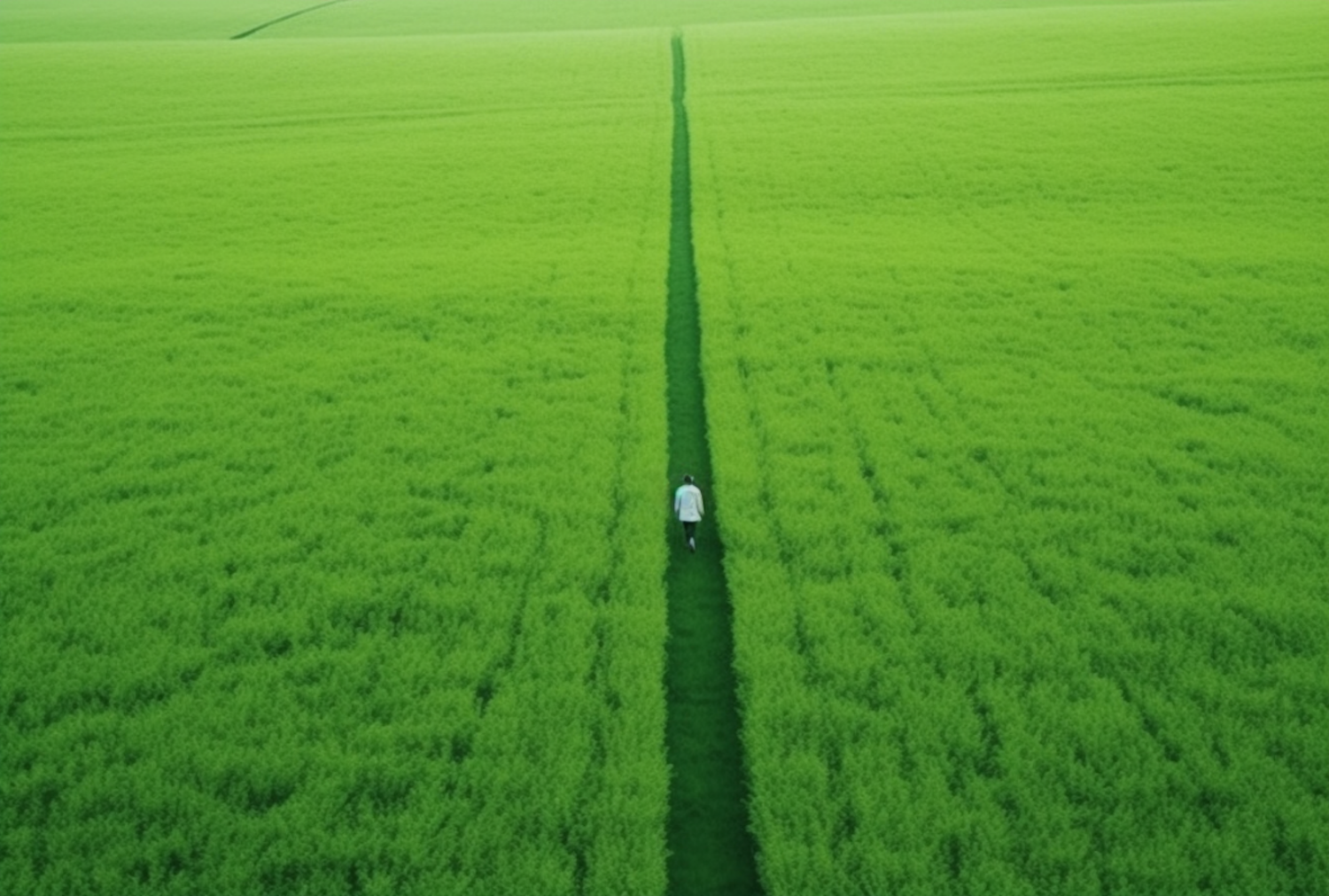 A person walks along a narrow path through a vast, lush green field, creating a striking contrast in the expansive landscape.