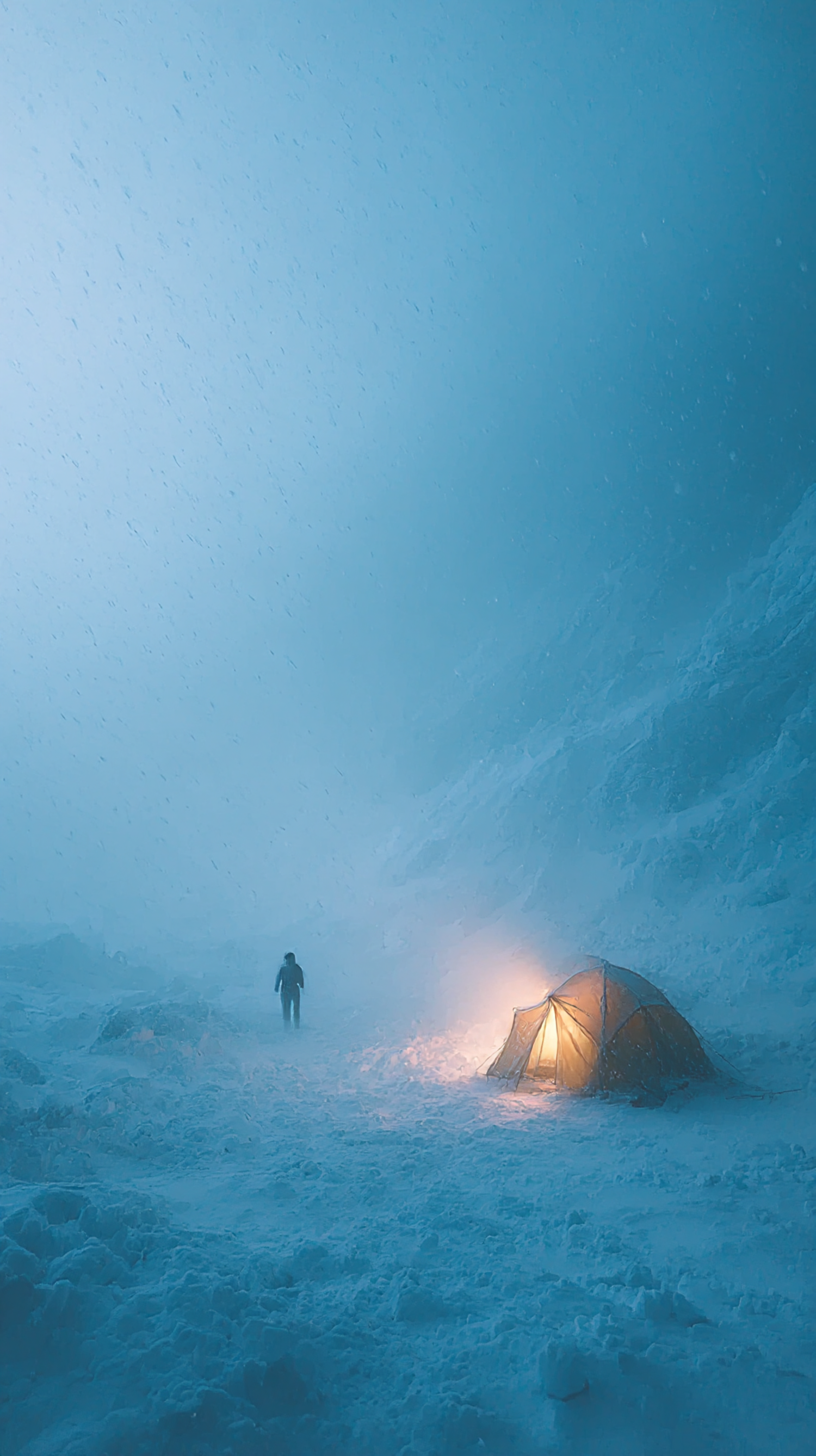 A glowing tent in a snowy mountain landscape with a lone figure nearby, under a serene, overcast sky.