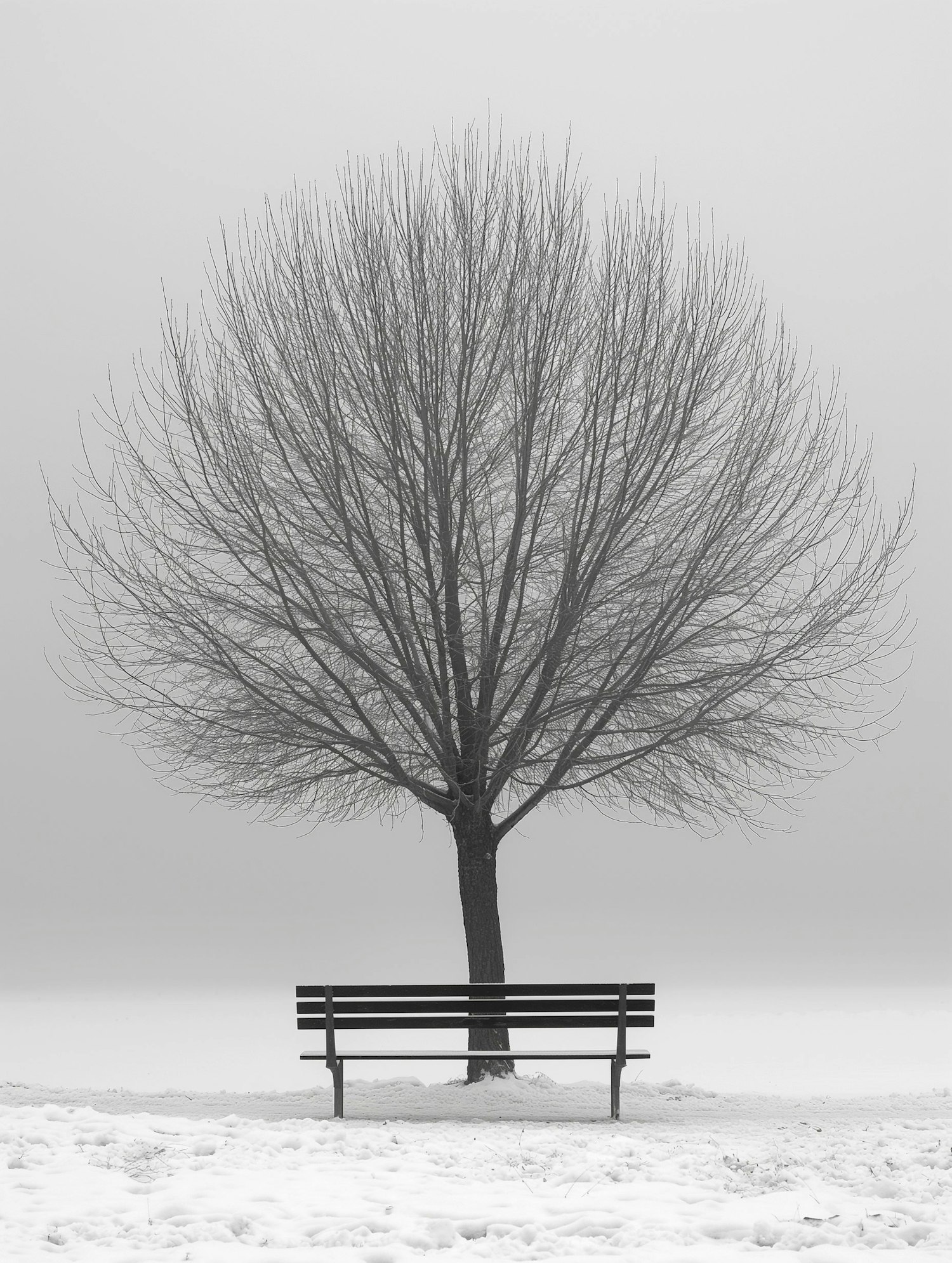 A solitary tree and bench in a snowy landscape, creating a serene and symmetrical winter scene.