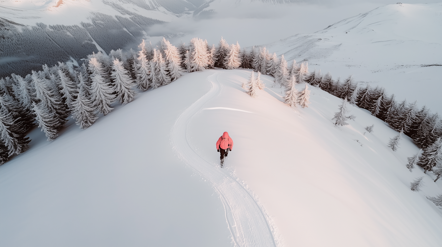 A lone hiker in a pink jacket walks through a snowy mountain path, surrounded by snow-dusted evergreens under an overcast sky.
