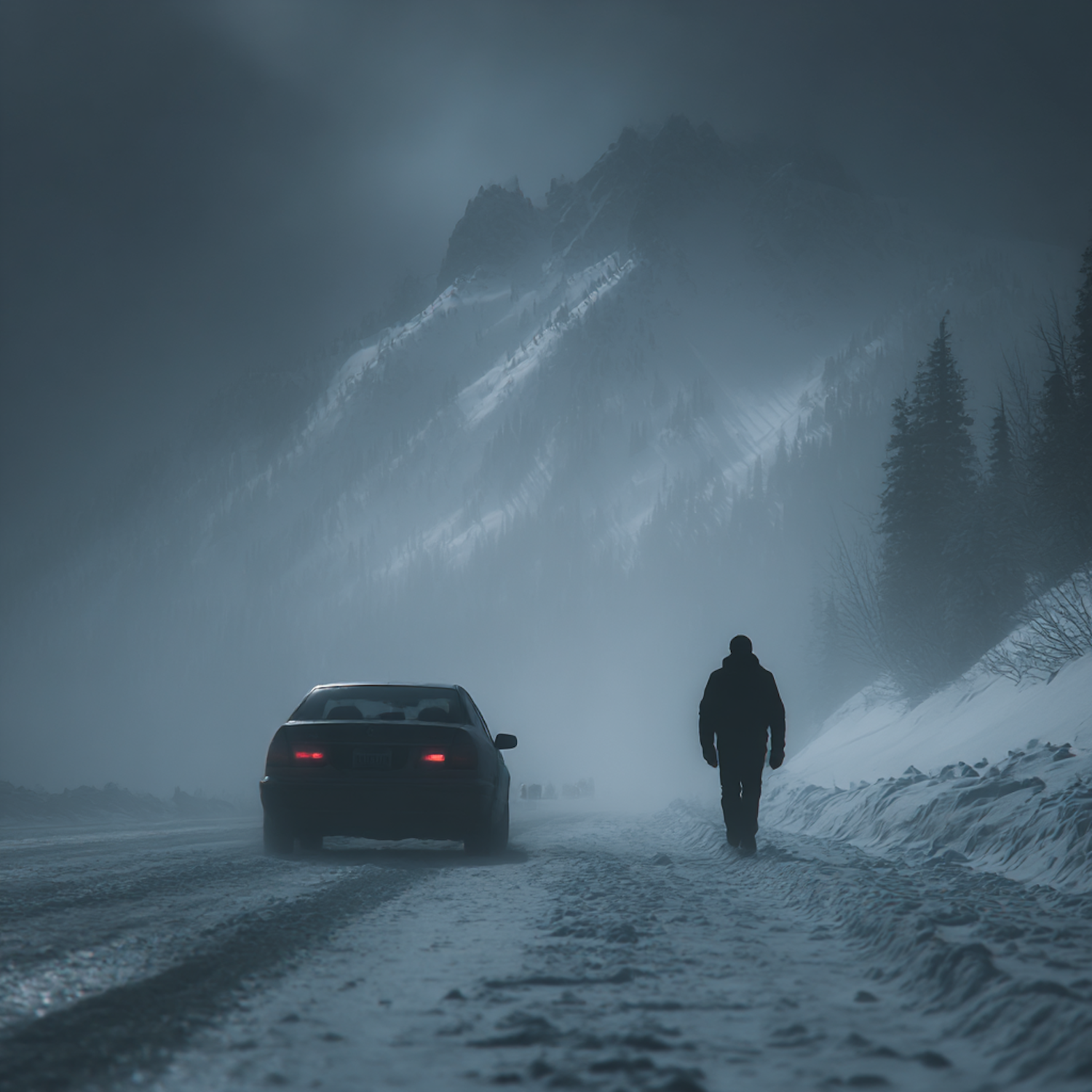 A lone figure walks on a snowy road near a parked car, with misty mountains in the background, creating a serene and mysterious winter scene.