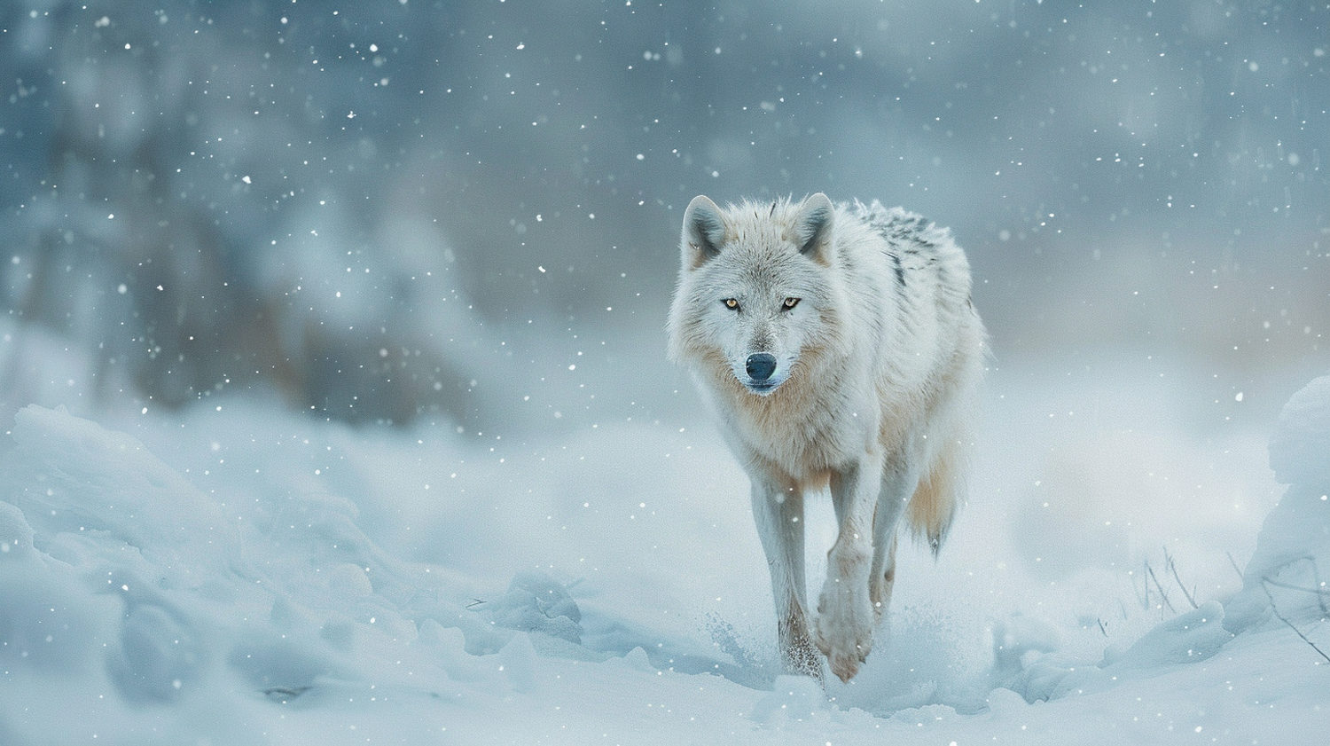A white wolf with piercing yellow eyes walks through a snowy landscape, surrounded by falling snowflakes and a serene winter backdrop.