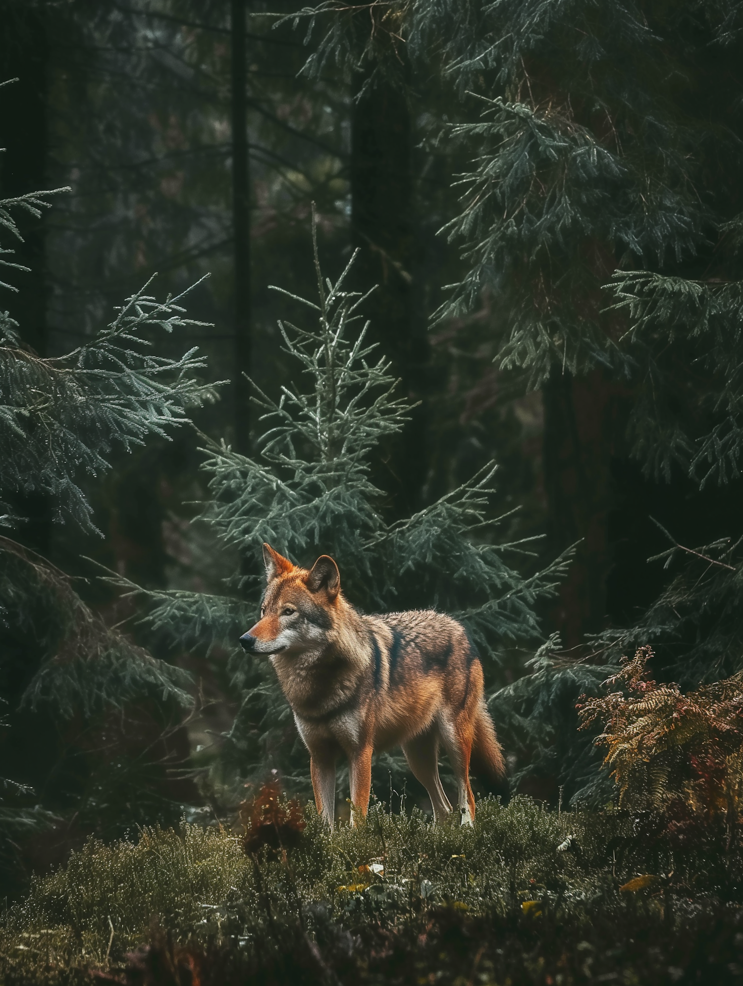 A majestic wolf stands in a lush, dimly lit forest surrounded by evergreen trees, exuding grace and alertness in its natural habitat.