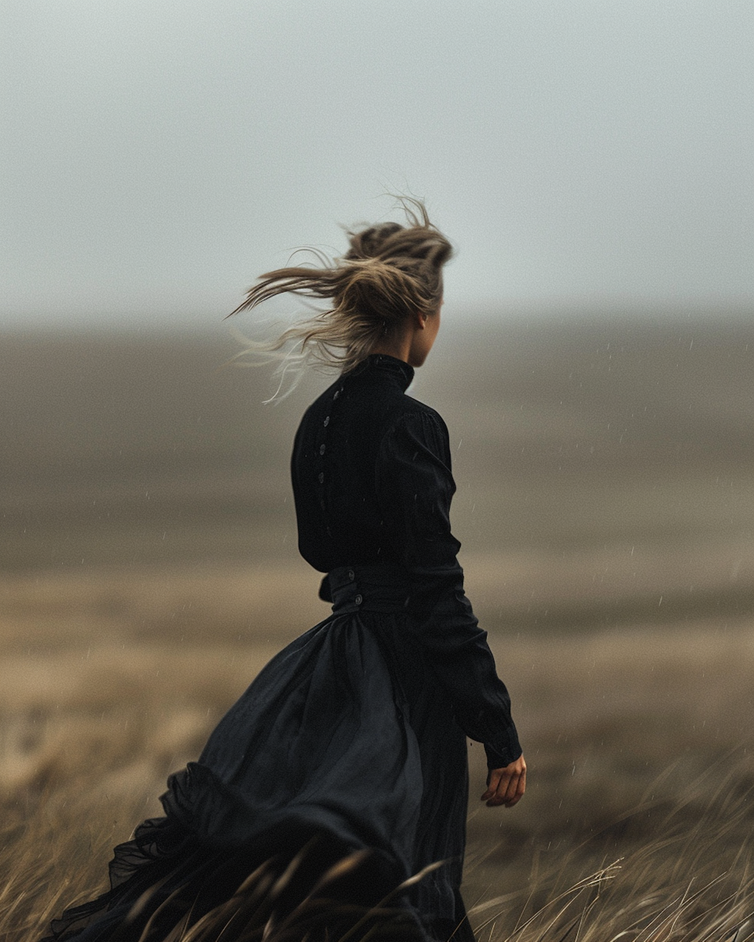Woman in a black dress stands in a windswept field, her hair blowing in the wind, under an overcast sky, evoking solitude and contemplation.