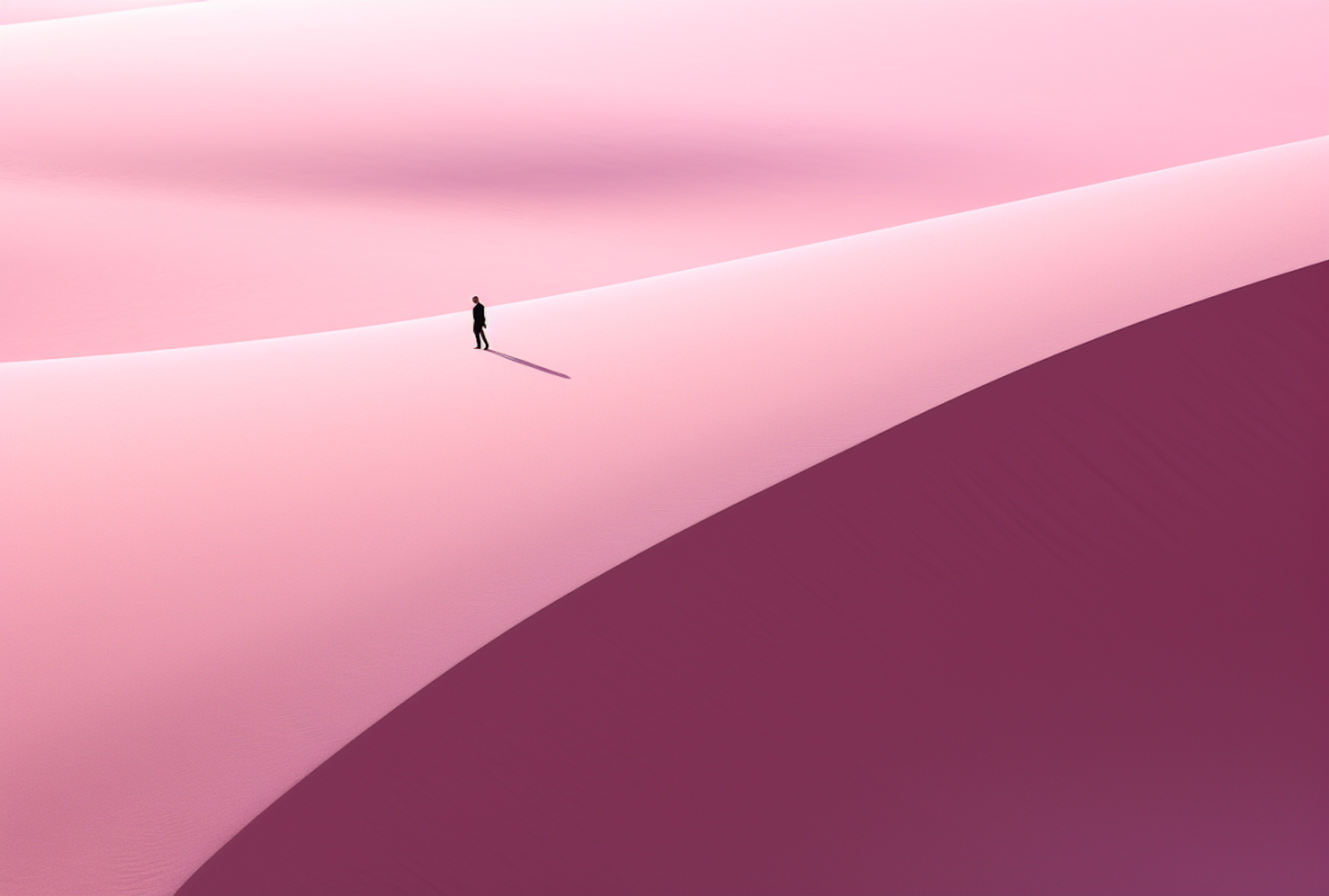 A solitary figure on pink sand dunes, casting a long shadow. The scene is serene with soft pink and purple hues, evoking solitude.