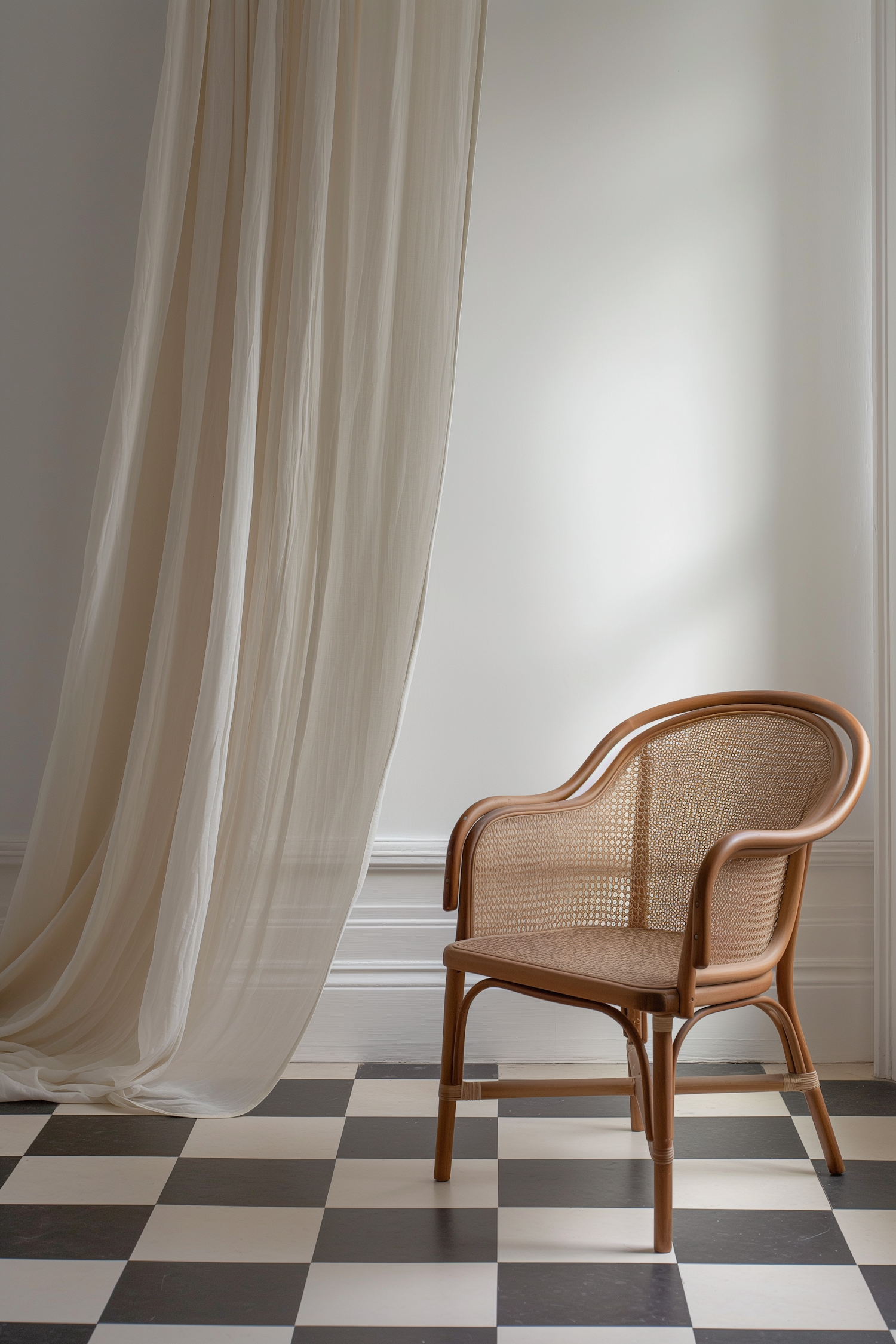 Elegant wooden chair with woven design on a checkered floor, complemented by a flowing beige curtain in a minimalist setting.