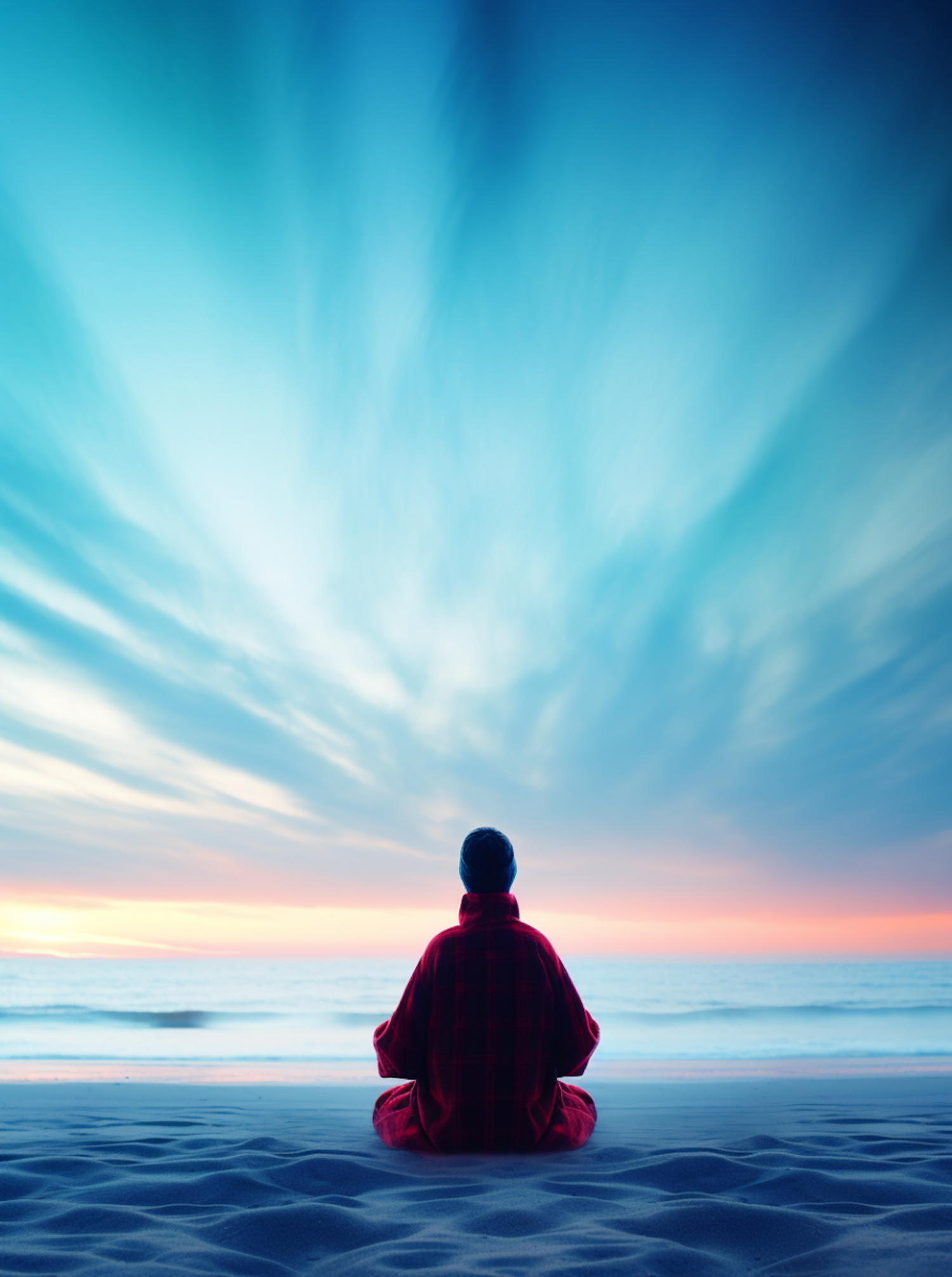 Person in red robe meditating on a serene beach with a stunning blue and pink sky at sunset.