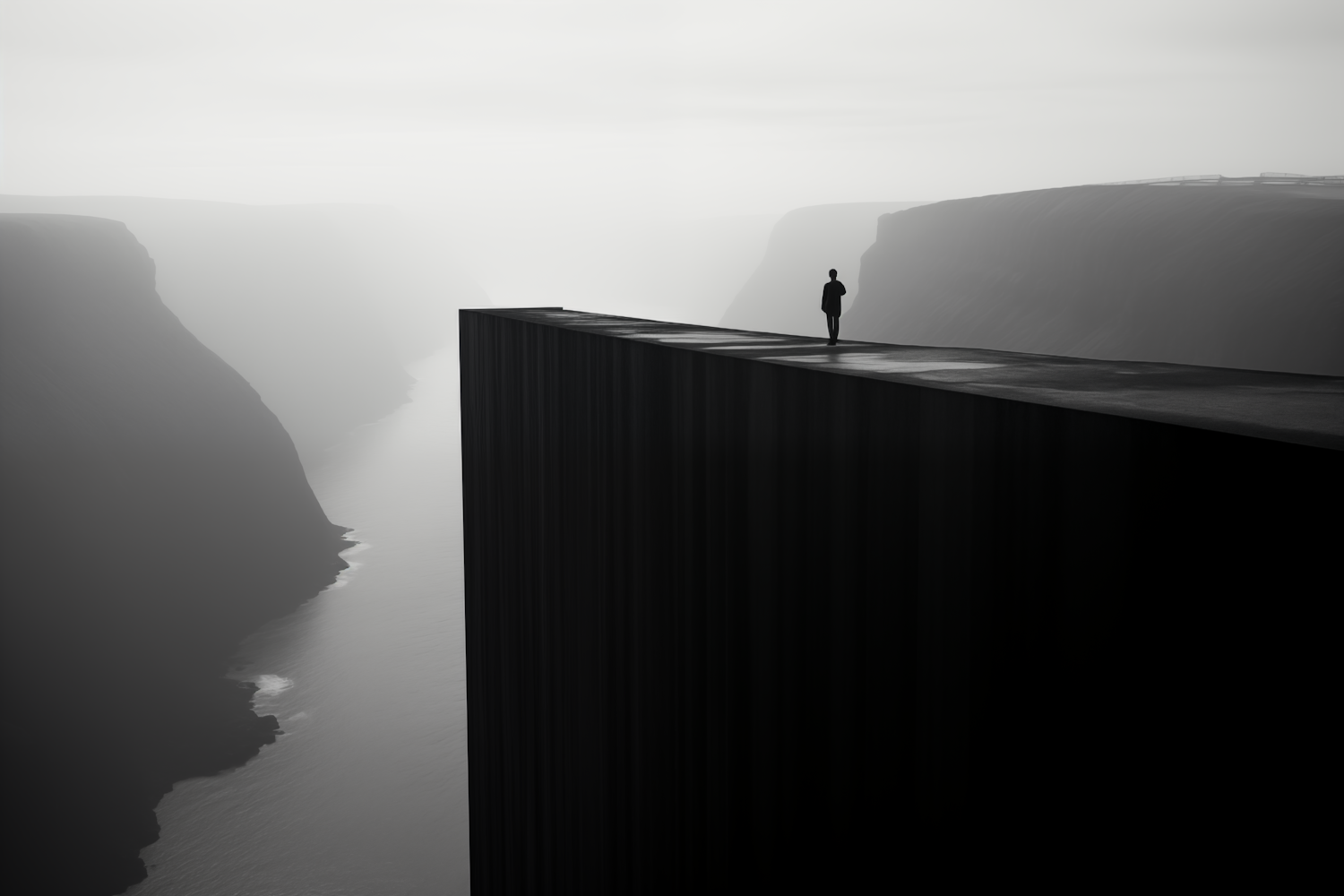 A lone figure stands on a massive structure overlooking a misty canyon, creating a surreal and contemplative scene.