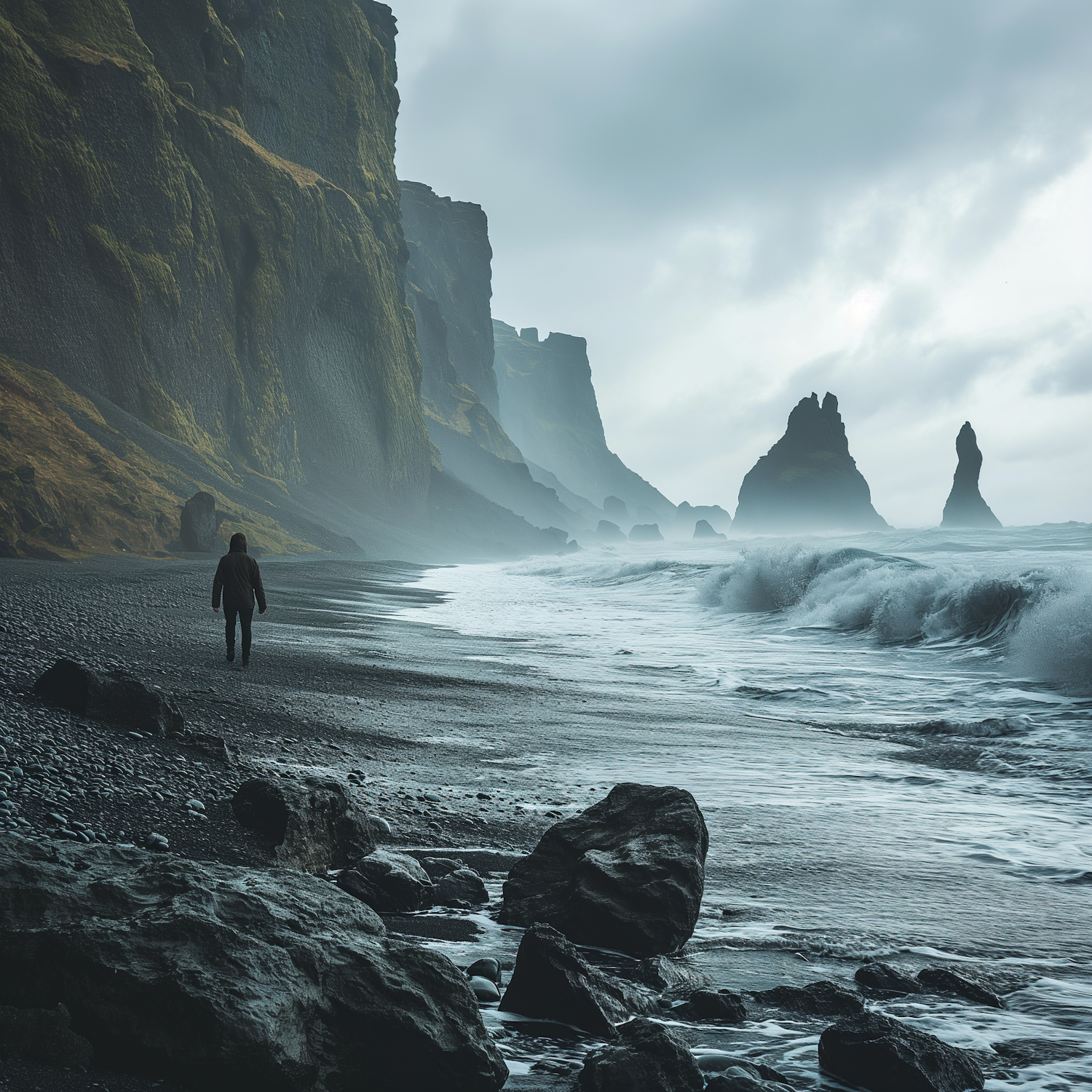 A lone figure walks on a black sand beach with towering cliffs and misty sea stacks, creating a dramatic and moody coastal scene.