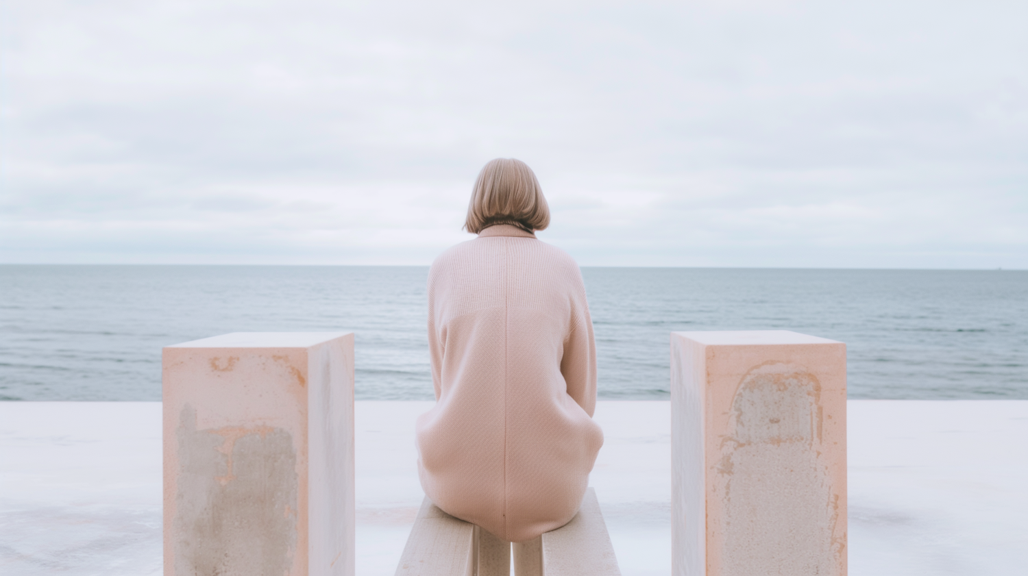Person in a pink sweater sits on a bench facing the ocean, framed by concrete blocks, under a cloudy sky.