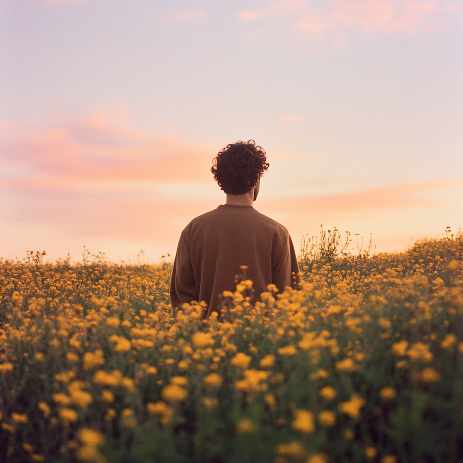Person in a field of yellow flowers at sunset, wearing a brown shirt, with a serene pink and orange sky in the background.