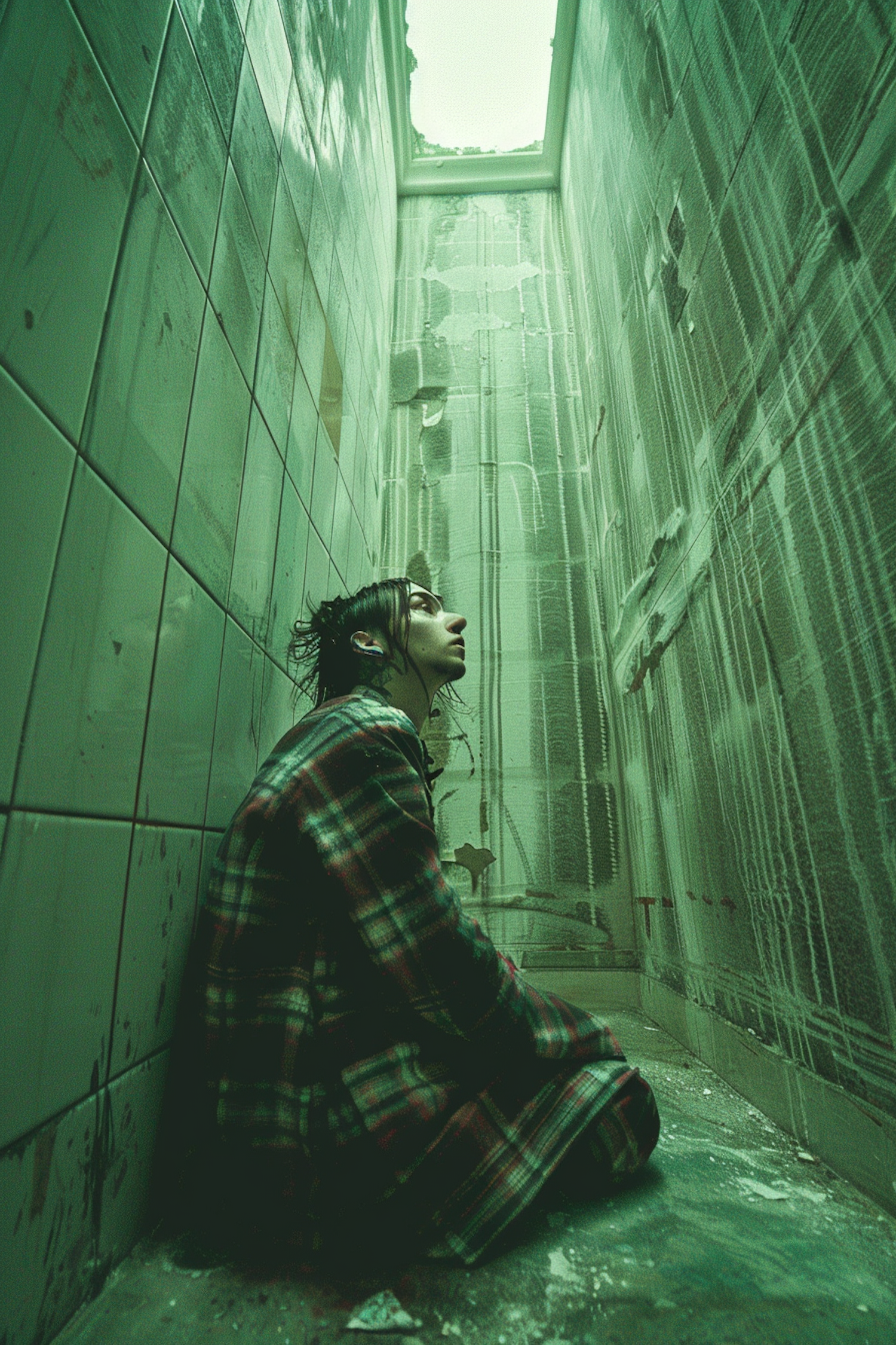 Person in a plaid coat sits in a narrow, grimy, green-tinted room, looking upwards. The scene is somber and introspective.