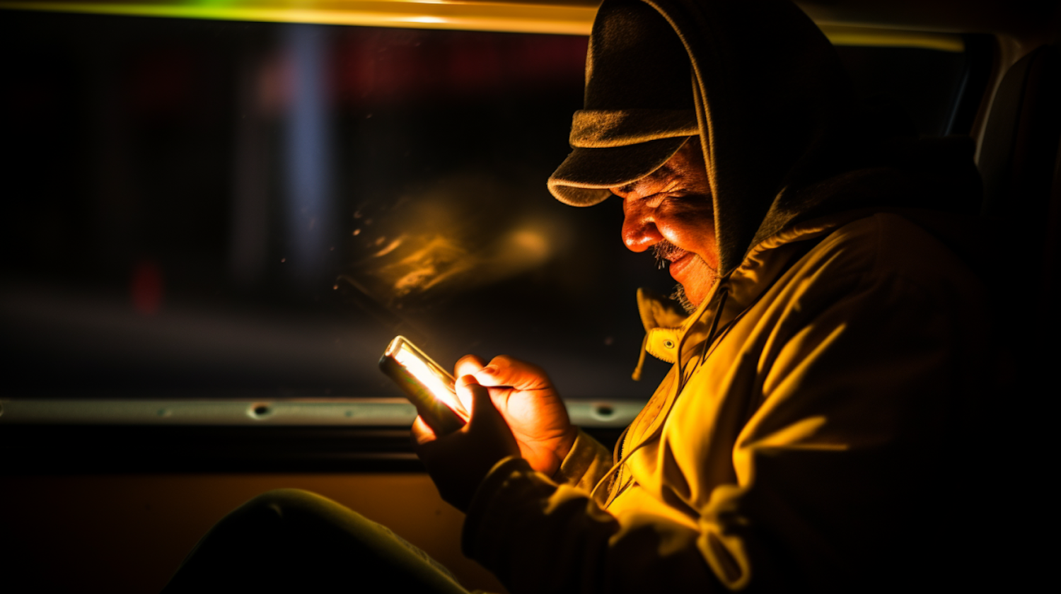 Man in a hooded jacket engrossed in his smartphone, illuminated by its glow in a dimly lit setting.