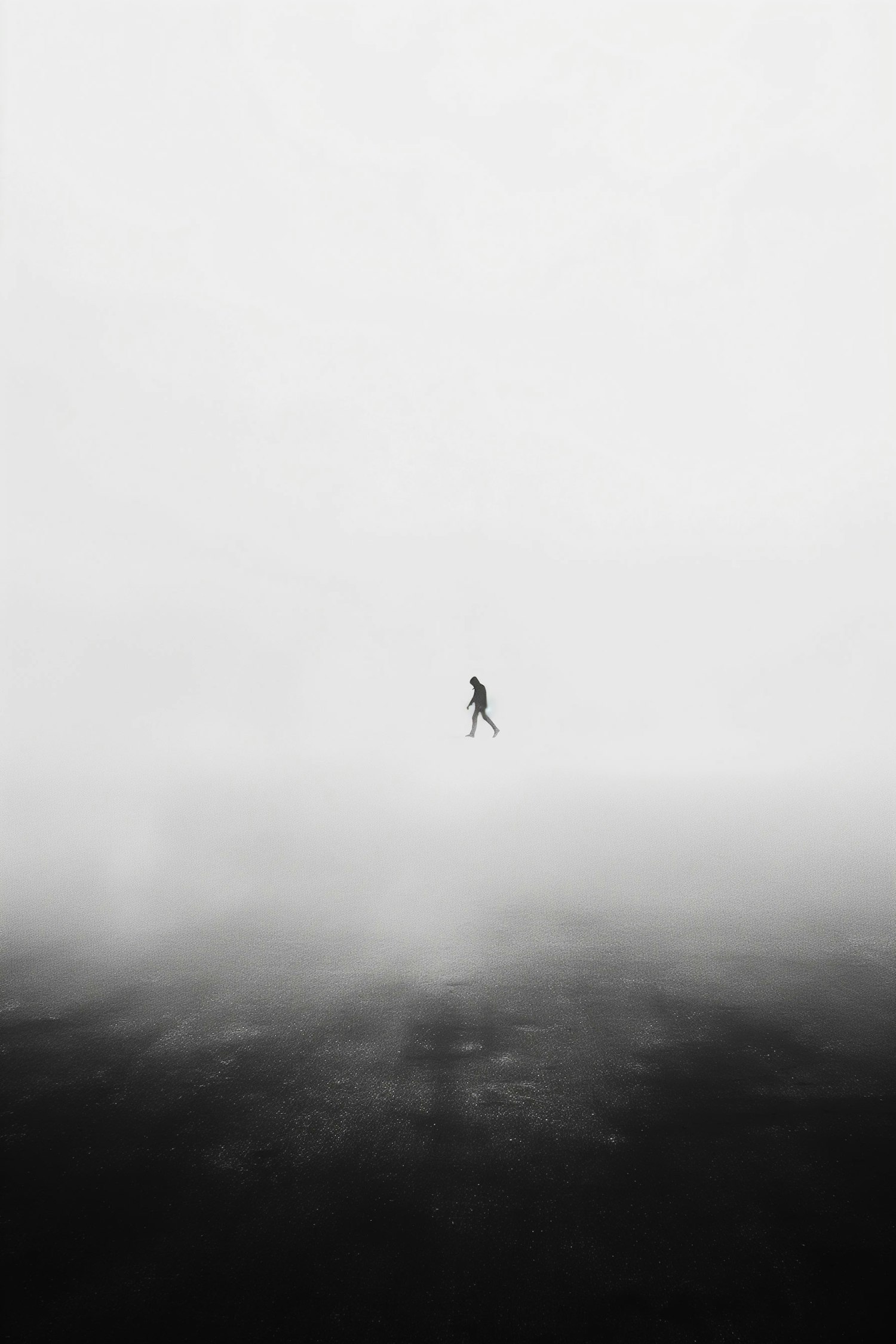A lone figure walks through dense fog, creating a mysterious and ethereal scene with a monochromatic palette of grays and whites.