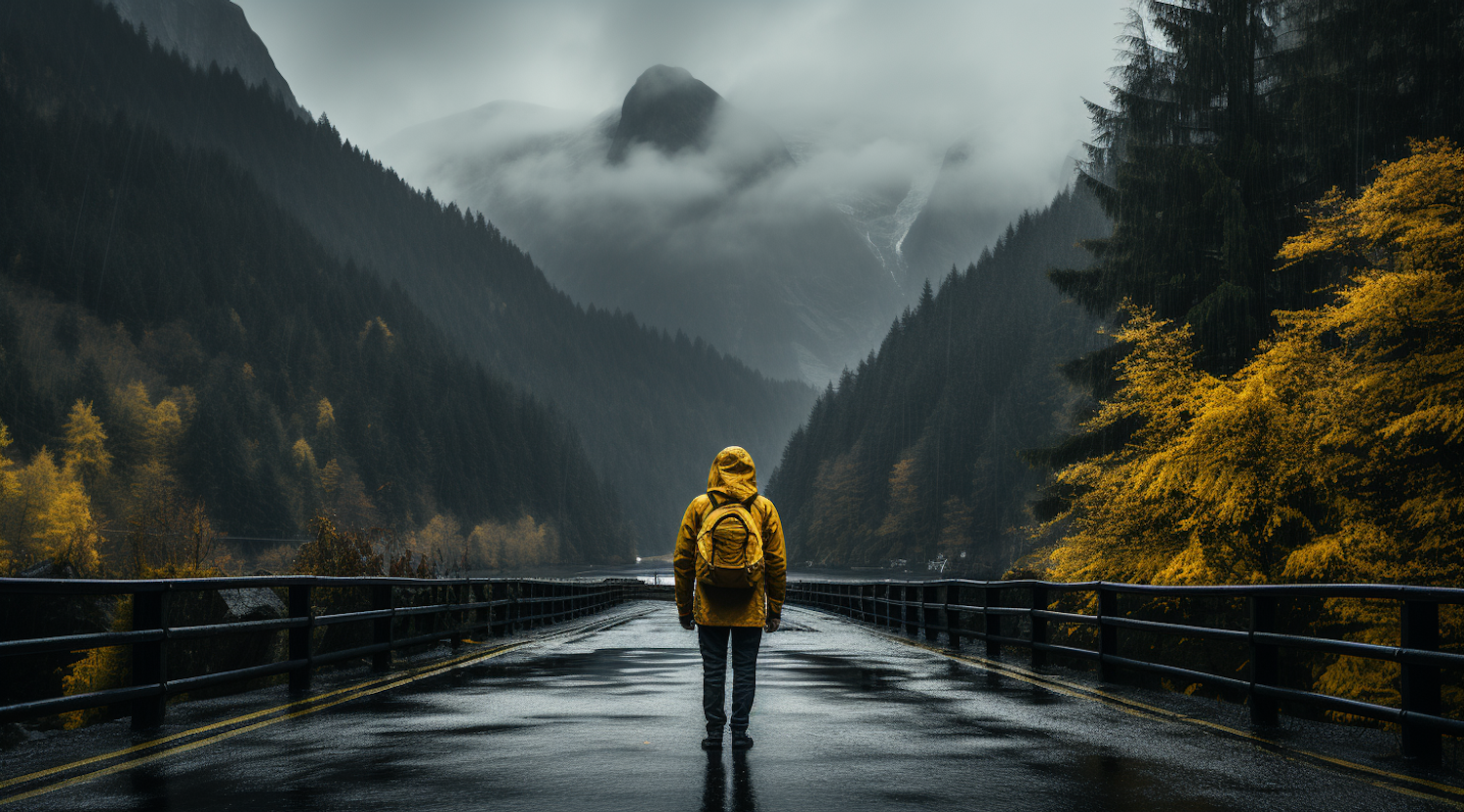 A lone traveler in a yellow raincoat stands on a misty mountain road, surrounded by autumn trees and towering peaks.