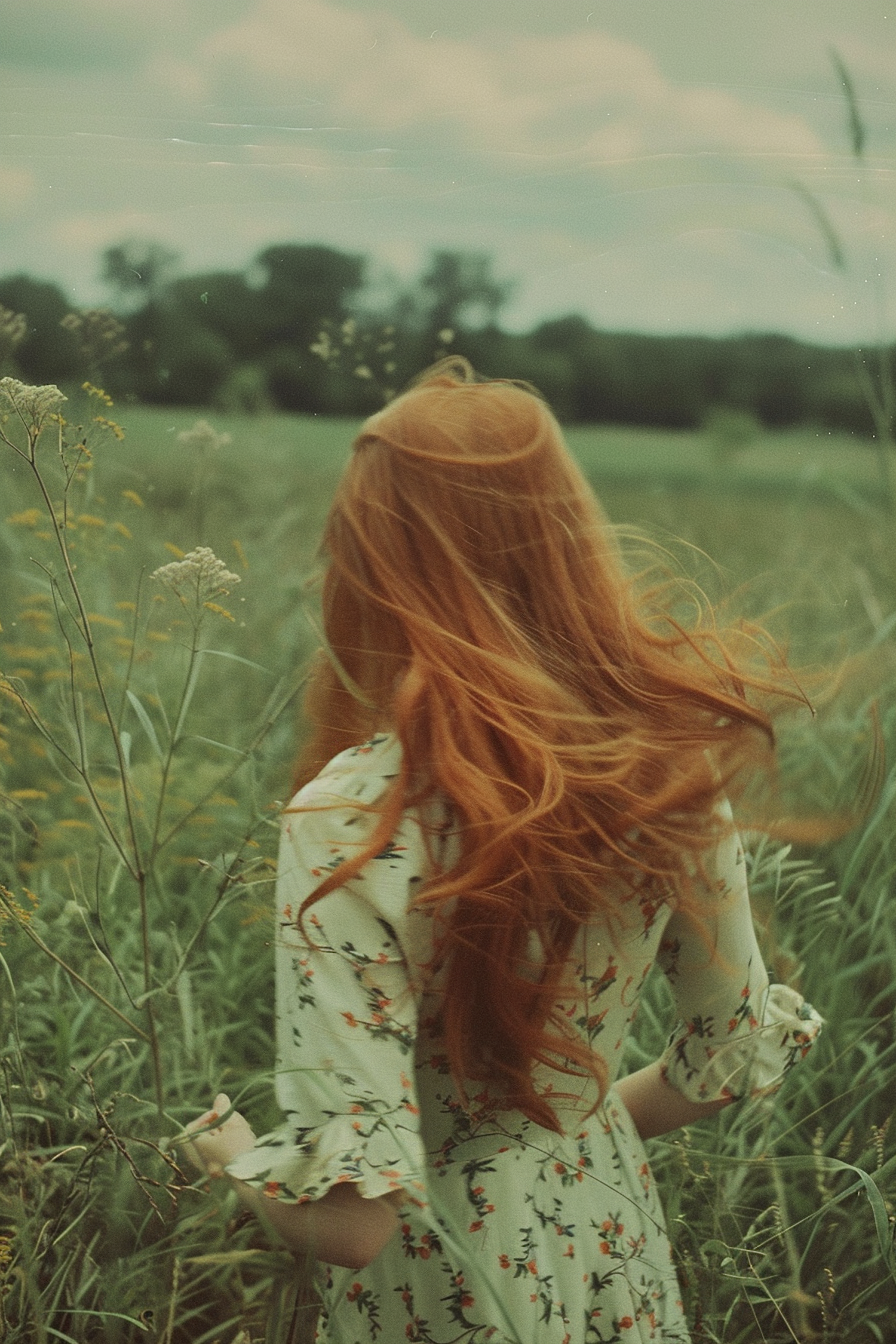 Woman with flowing red hair in a floral dress stands in a lush green field, surrounded by wildflowers and tall grasses under an overcast sky.