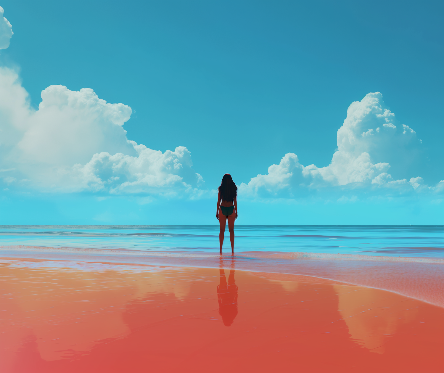 A person stands on a tranquil beach, facing the ocean under a bright blue sky with fluffy clouds. The sand reflects warm hues.