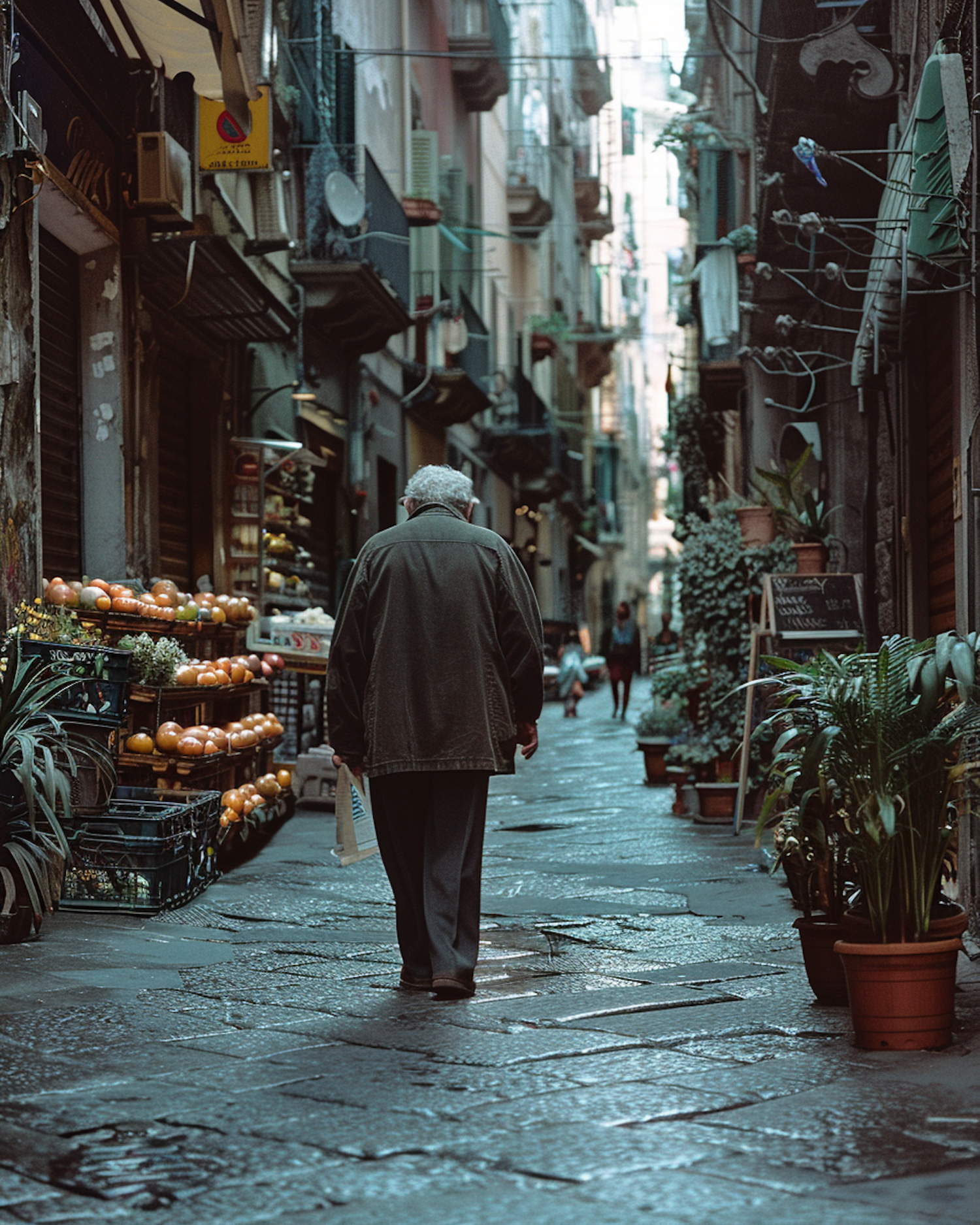 Elderly man walking down a narrow, cobblestone street lined with shops and plants, capturing urban charm and daily life.