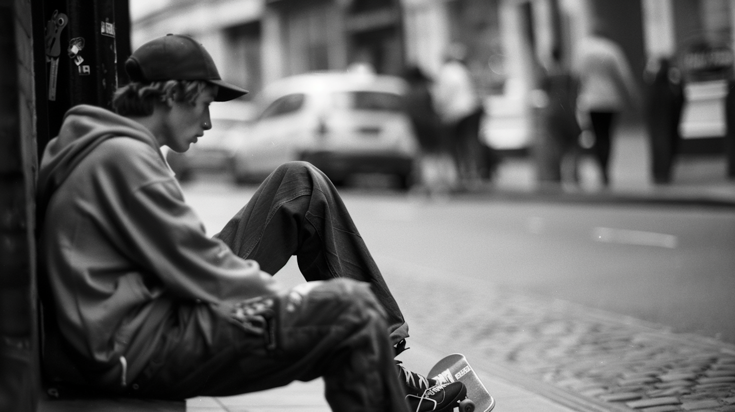 Young man in a hoodie and cap sits on a city sidewalk with a skateboard, captured in a contemplative black and white scene.