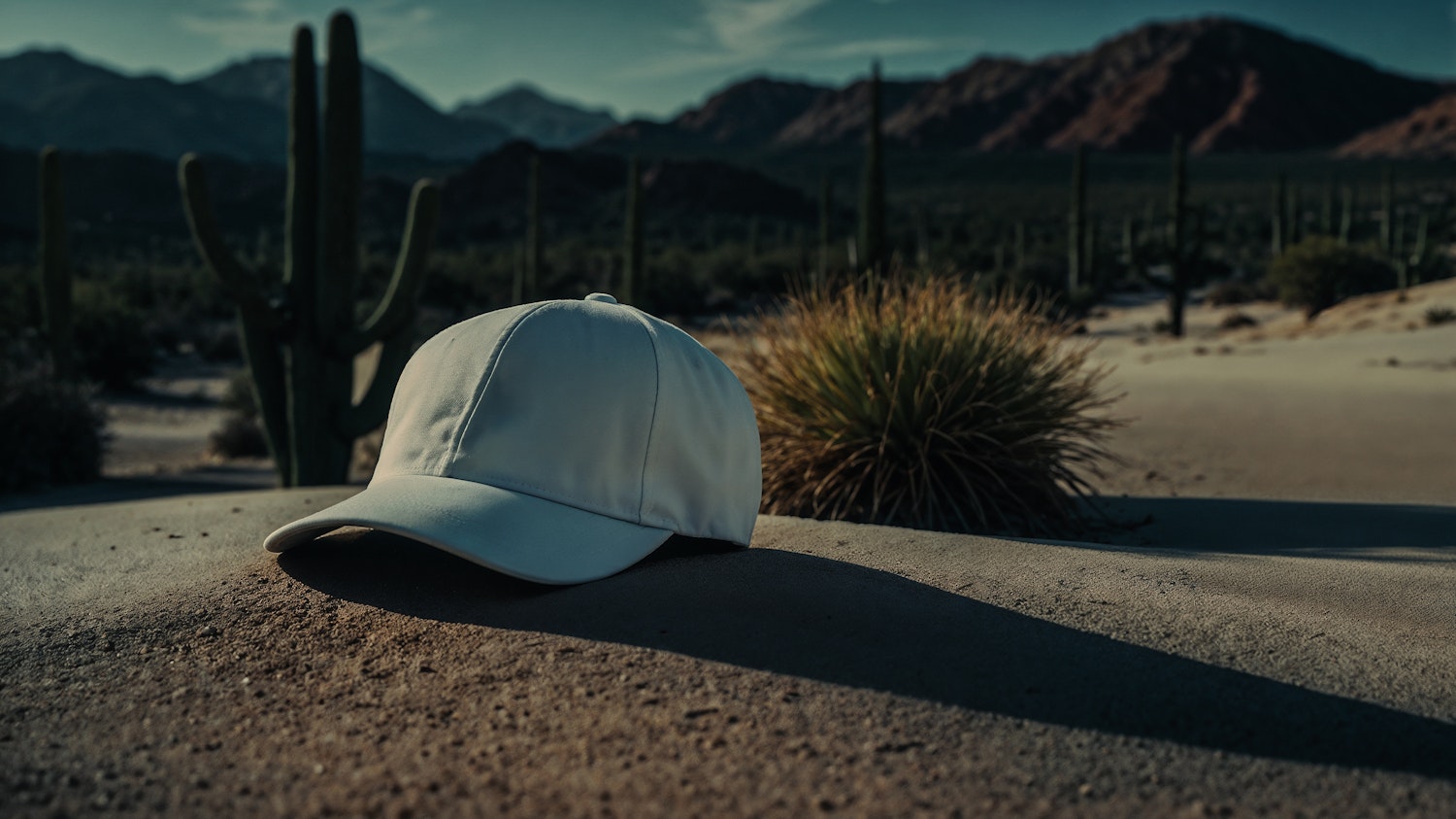 White baseball cap on a sandy dune in a desert with cacti and mountains in the background, bathed in warm sunlight.